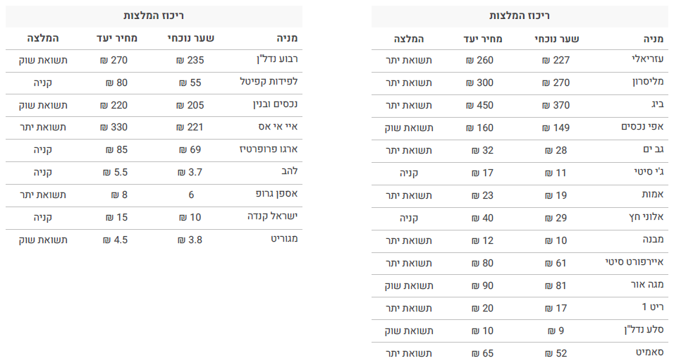 המניות בסקטור: שפיר, תשואת שוק, במחיר יעד של 26 שקל למניה; דניה , תשואת יתר, מחיר יעד של 115 שקלים; אשטרום , תשואת שוק, במחיר יעד של 65 שקלים; שיכון ובינוי, תשואת שוק, במחיר יעד של 12 שקלים.