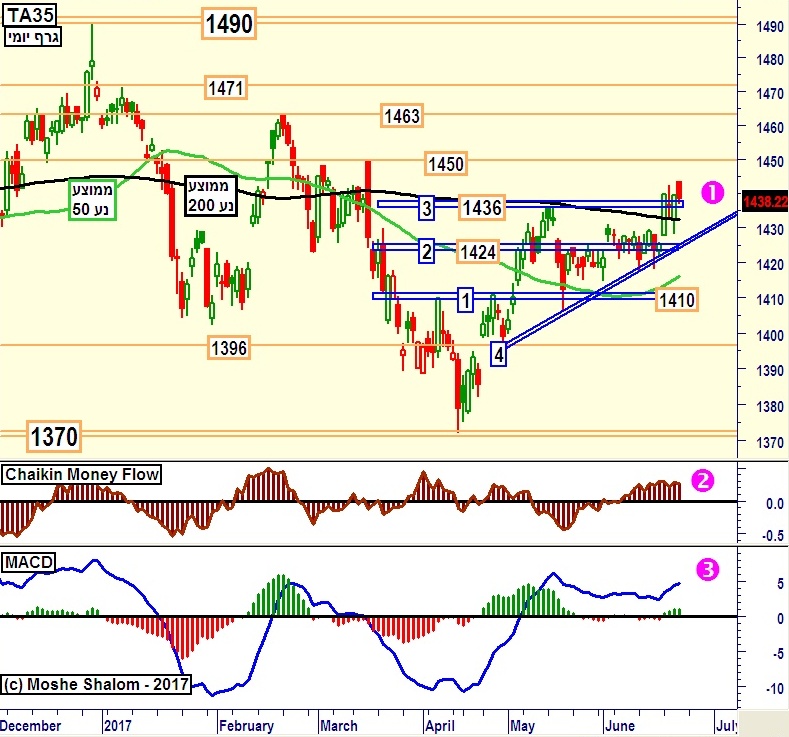 כל זה חיובי למדי למרות שעל הדולר המקומי שלנו להיות אסרטיבי הרבה יותר בעתיד הקרוב על מנת לשכנע אותנו בחיוב לטווחים היותר רחוקים. יש לציין שאנו כבר שמים לב לכמה מן הסממנים המקדימים: פריצת קו המגמה במומנטום, ב-2 סגול, והתחלה של תאוצה חיובית, על ידי קווי היסטוגרמה ירוקים, ובמיוחד פריצה מעלה של קו המגמה 1. כל אלו אכן נראים כמו התחלה חיובית מעניינת.
