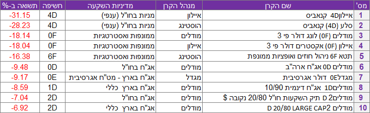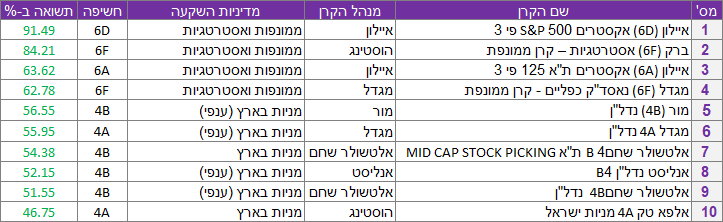 הקרן עם התשואה השנתית הגבוהה ביותר היא "איילון (D6) אקסטרים 500 S&P פי 3", שזינקה ב- 91.49%; הקרן עם התשואה הגרועה ביותר היא "איילון 4D קנאביס" שירדה ב- 31.15%