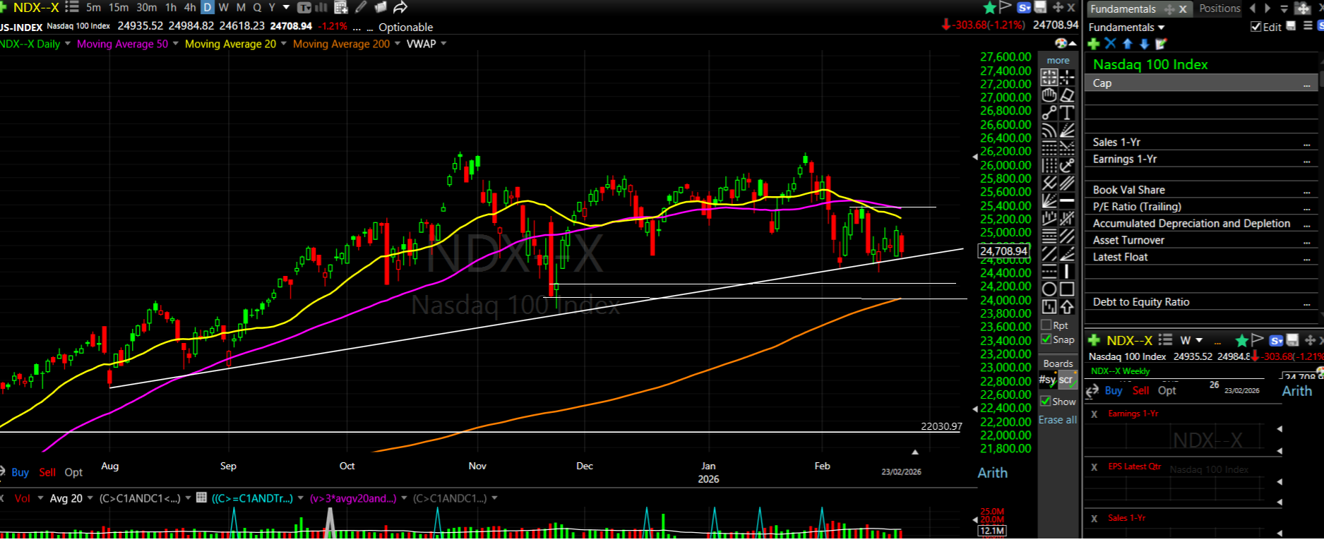 בתכלס מצד אחד לא קורה כלום בצד של המדדים הם ממשיכים לדשדש בלי לשבור רמות חשובות אבל המון מניות גם גדולות ובינוניות יורדות חזק ועושת תמחור מחדש כדוגמת SOFI ו NFLX וORCL ועוד מלא שלא לדבר על קטנות כגון קוואנטים וכו לכן חייבים לעבוד זהיר בסלקטיביות בסבלנות אפשר גם לשבת בצד קצת או לשים סטופים קצרים בדיוק כמו הדוגמה של MSFT שנתתי כאן . NDX-- ממשיך לדשדש במידה וישבור שוב 24455 יירד לסגור את הגאפ התוך יומי ב24240 ואם זה לא יחזיק אז לכיוון 24054 כל עוד אין שבירה של הנמוך של שישי 24633 עדיין אפשר לחזור למעלה לכיוון 25350