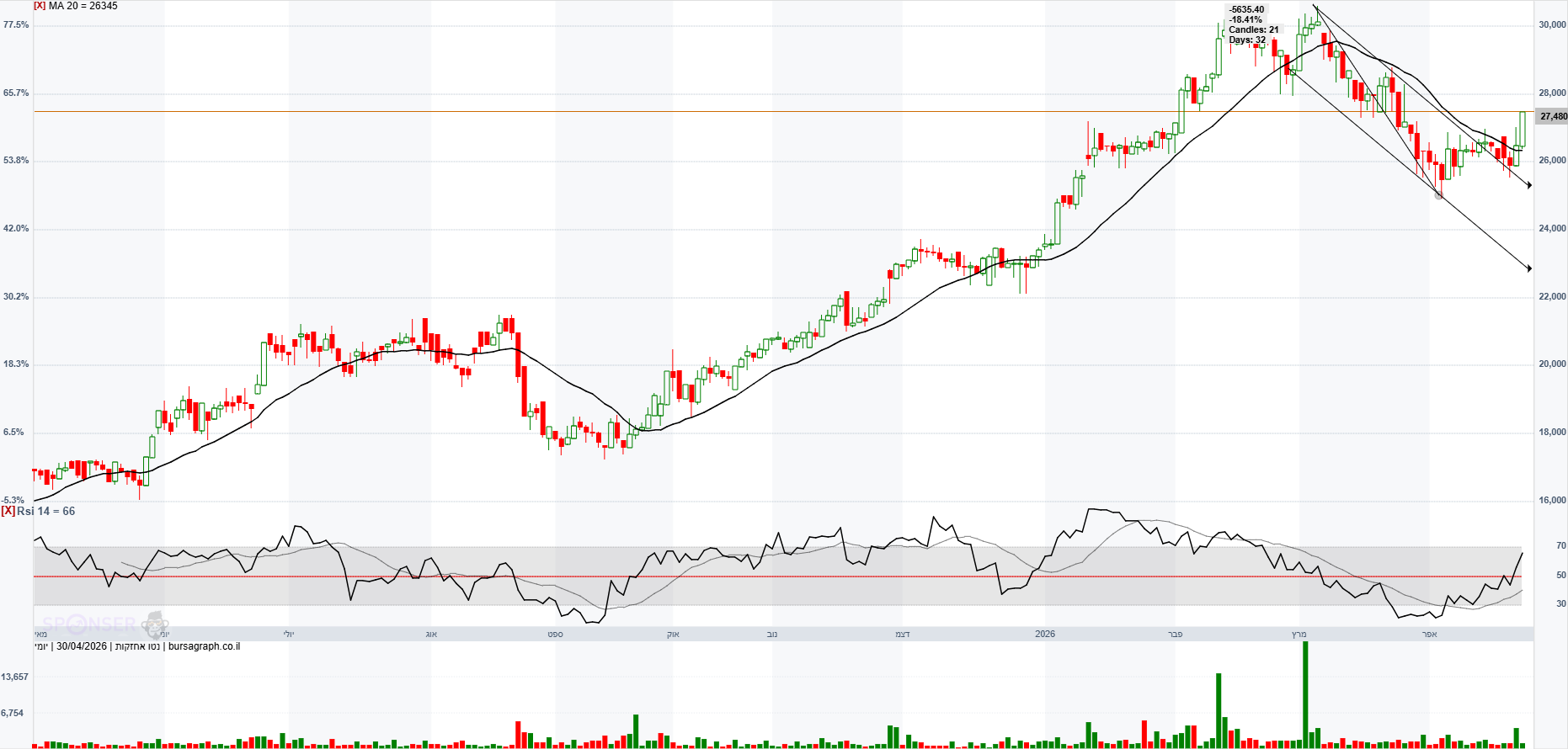 עסקה של כמעט 2 מיליון ש"ח בנעילה הורידה אותה אל מתחת לשער 4200 כדי לנשום אוויר. נקווה שנראה התבססות מעל 4300 ומשם שער 4500 הוא לא מילה גסה. מחזיק כמות משמעותית בהפסד.