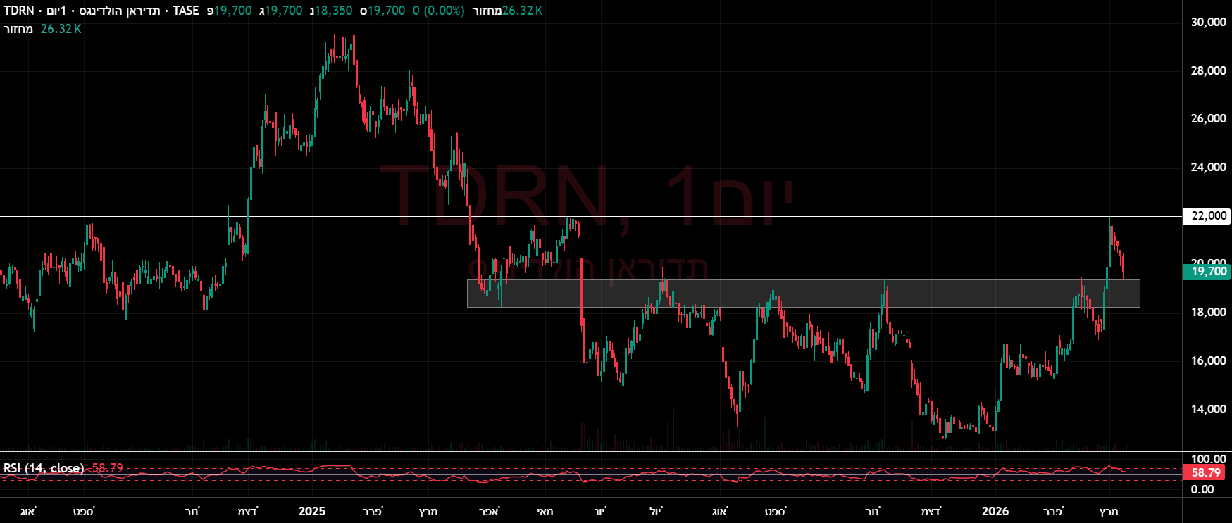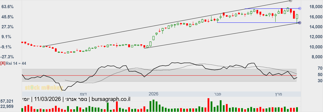 ירידה חדה,ויחד עם רוב מניות הארגיה הירוקות, נגעה בתחתית המלבן,ולמעשה יצרה תחתית כפולה שורית,והתהפכה וכמעט סיימה בגבוהית יומית,ונכון לעכשיו עשויה לחזור ליעד של 18100,ועם טריגר מהמתנד הנמוך שנמצא ב-44,והמחזור הגבוה מאד שנתקבל בסגירה.