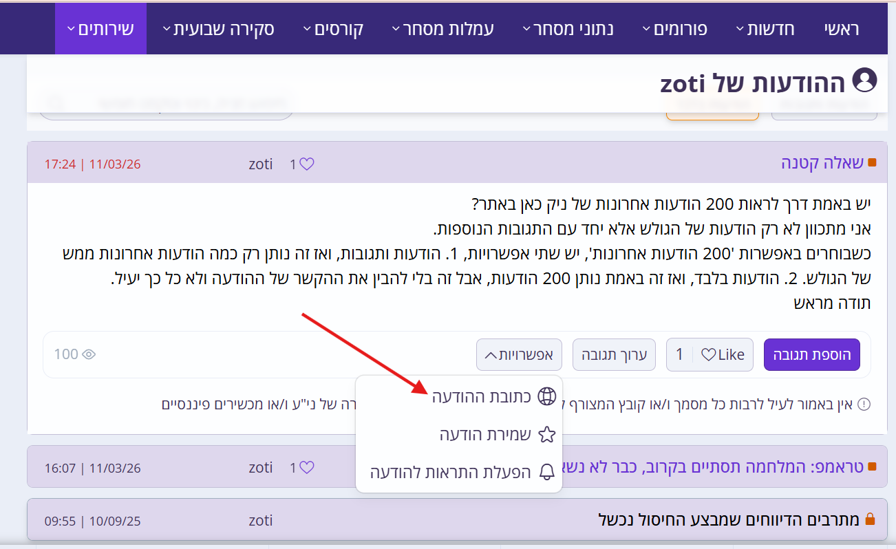 יש באמת דרך לראות 200 הודעות אחרונות של ניק כאן באתר? אני מתכוון לא רק הודעות של הגולש אלא יחד עם התגובות הנוספות. כשבוחרים באפשרות '200 הודעות אחרונות', יש שתי אפשרויות, 1. הודעות ותגובות, ואז זה נותן רק כמה הודעות אחרונות ממש של הגולש. 2. הודעות בלבד, ואז זה באמת נותן 200 הודעות, אבל זה בלי להבין את ההקשר של ההודעה ולא כל כך יעיל. תודה מראש