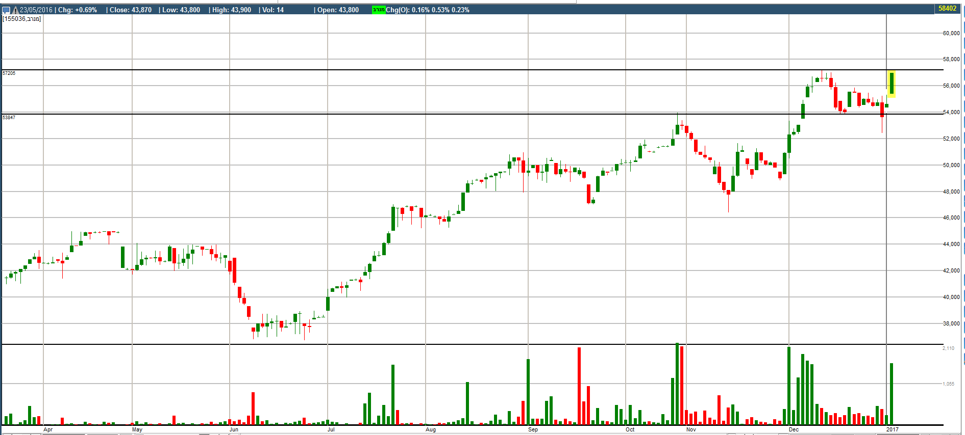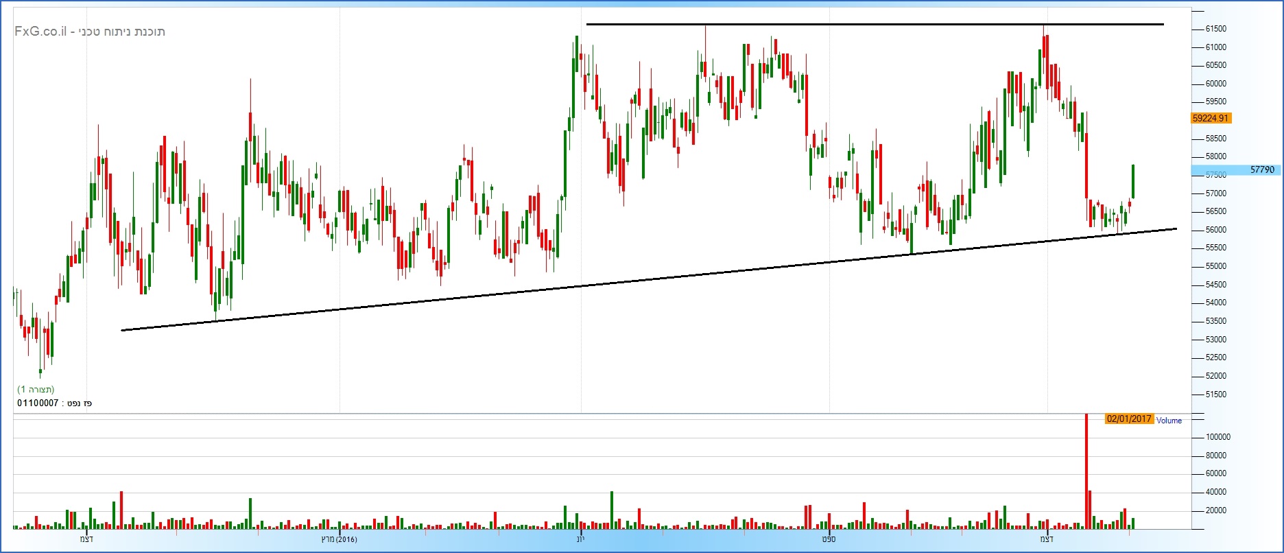 היום עלתה 2% ואכן ניתן לראות שנתמכה בקו התחתון ופרצה את 57000 ובכך הופכת חיובית לזמן הקרוב. ללא המלצה.