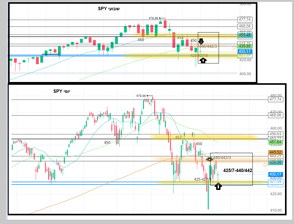 שלי שיסגרו ירוק וחיובי בסופ"ש נכשלה 🙇 קצת מרגיש לי בשישי האחרון כמו נובמבר דצמבר שמניות מכלל הסקטורים החלו להשיל רוחבית לסירוגין עוד שמדדים היו בשיאים. שורה תחתונה, דעכו ביומיים האלה ולקחו מטה רוחבית וקרובים לאיזורי תמיכה שוב. -------------------------------------- בכללי, SPY באותן גבולות של החודש האחרון: 425/7-440/2-453-6/7 ~ סנופי תחילת שבוע הגיע עד 441 ומשהו ומשם התקפל חזרה בסופ"ש לאיזור 427 וסגרו בשישי נר ירוק במקצת לסגירה אבל קדחו לרוחב קצת. נר שבועי, בדקו זנבות ונשארו באמצע, נר ירוק אמנם אבל מתח לשבוע הקודם. מעריך שבוע הבא יילכו לאחד מהקצוות . יש הרבה הודעות כלכליות שמשפיעות רוחבית על השוק במצור הכלכלי על רוסיה( והם בחזרה סנקציות על חברות מולם) ------------------ שבבים לקחו מטה ומדגדגים תמיכה, טכנולוגיות גם נר אדום חשוב שירימו ראש חזרה. פיננסים שם עוד נר אדום חזרה סביב תמיכה. וגם טבע נר אדום הפוך מטה 😖 ------------ בקיצור, רצוי בלימה חזרה , בינתיים שווקים מתנהגים אותו דבר בתקופה האחרונה. הסכם רגיעה הומנטרית וכול (חשבתי יקרין בשישי) אולי יציב אופטימיות שוב לתחילת שבוע וחשובה התייצבות ו2 נרות שבועיים ירוקים עוקבים בשביל זה . שיהיה בהצלחה לכולם 👍