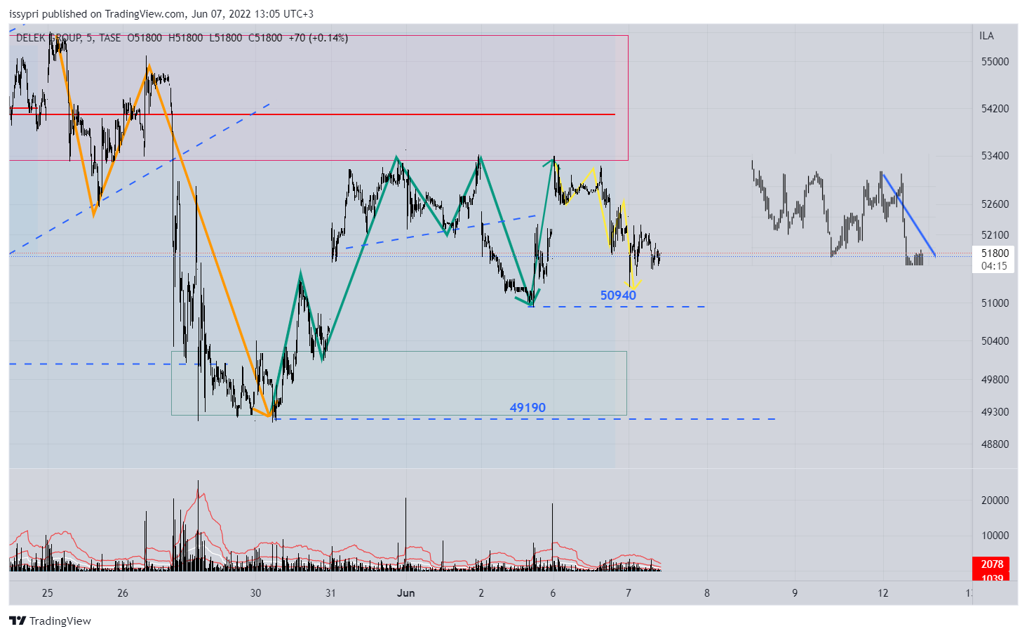 המחיר בין היצע וביקוש כפי שהעלתי בסקירות הקודמות. שוב רואים את לחץ המכירות. המחיר הגיע לפאתי הרצועה ולא הצליח לעבור אותה. שני קוים חשובים - 50940 הראשון. אם הוא נשבר המחיר הולך ל 49140. זה יהיה אישור חזק שאנחנו מסתכלים על דגל דובי (הפצה מחדש).