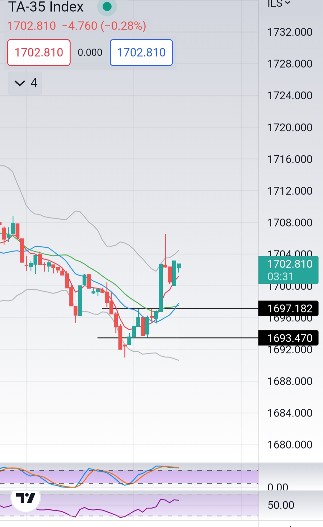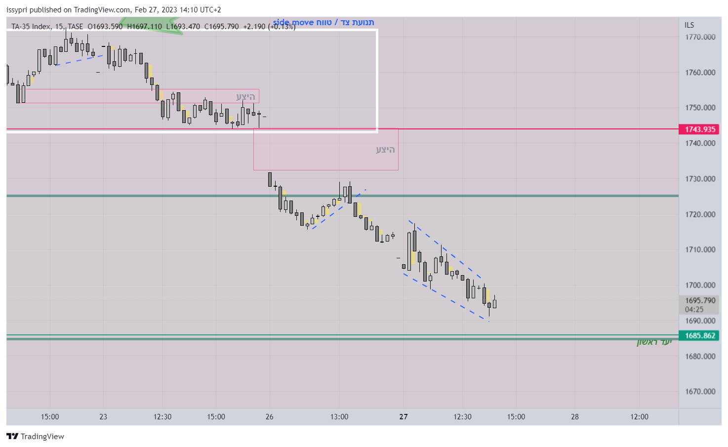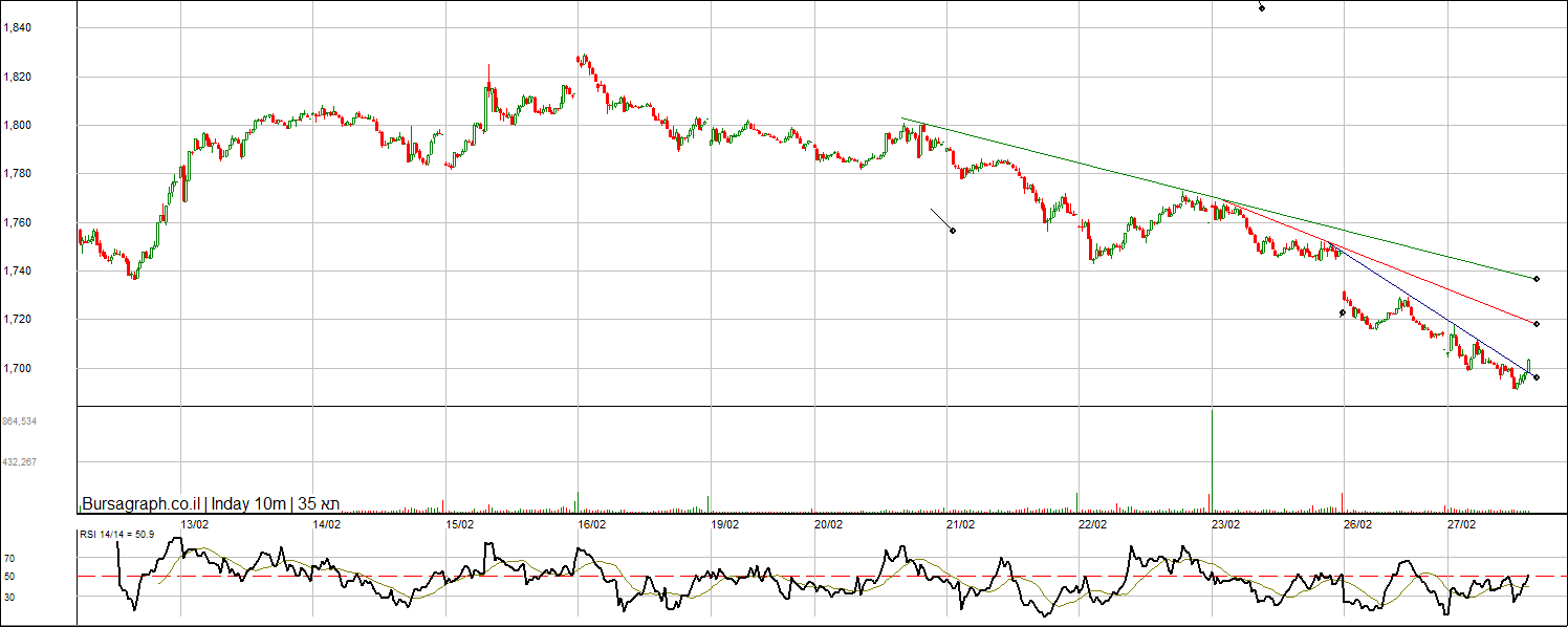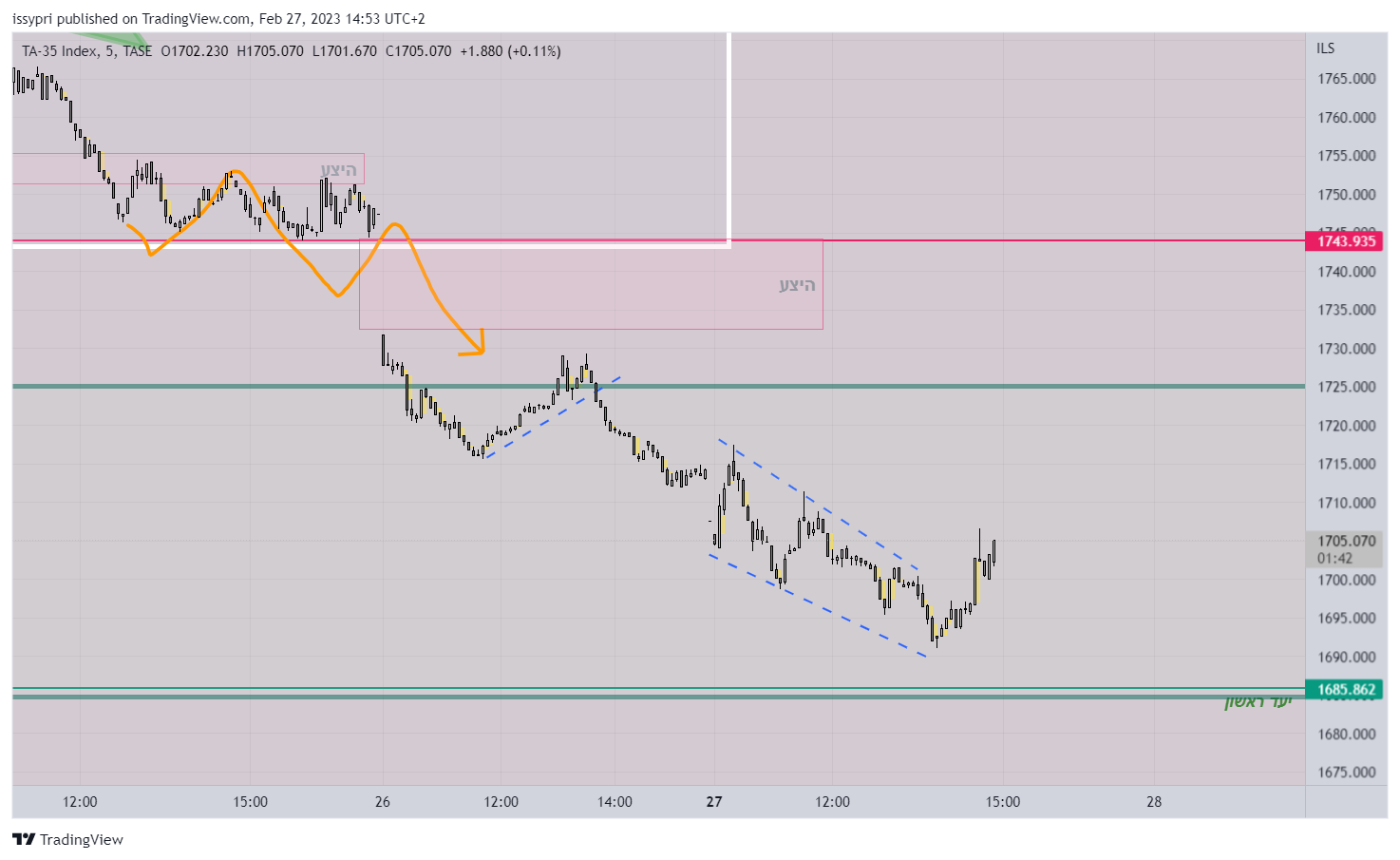 המחיר קרוב מאוד ליעד הראשון בתמונה הגדולה יותר כתבתי אתמול שהמחיר סביר להניח יבלום ברצועה הזאת. התנועה של המחיר כרגע מזכירה יתד שורית. זה תוצאה של עיכול בפקודות BUY LIMIT אנחנו צריכים לראות תגובה חזקה למעלה כדי להגיד שבלמנו (לפחות עד 1710). כרגע אנחנו עוד לא שם.
