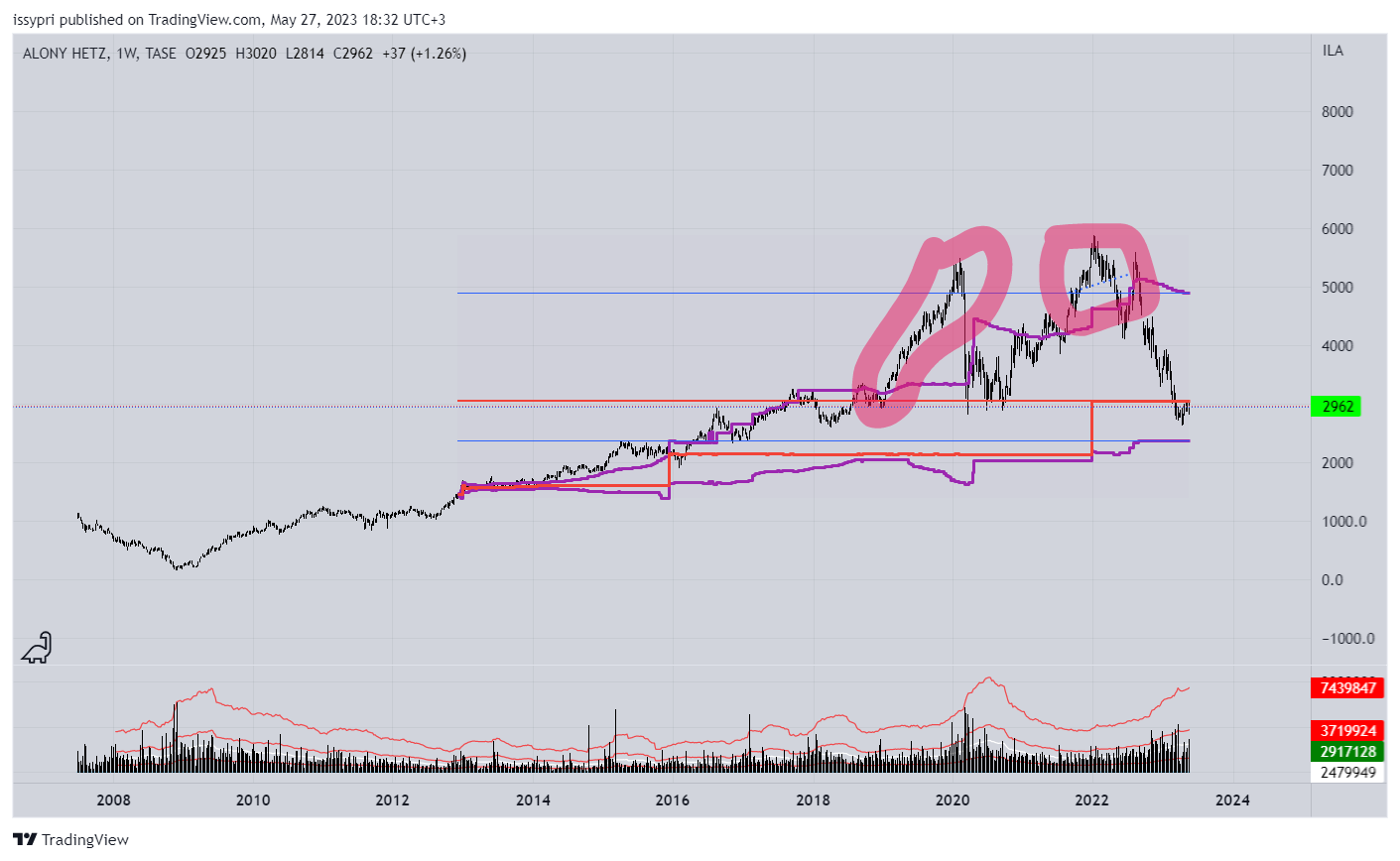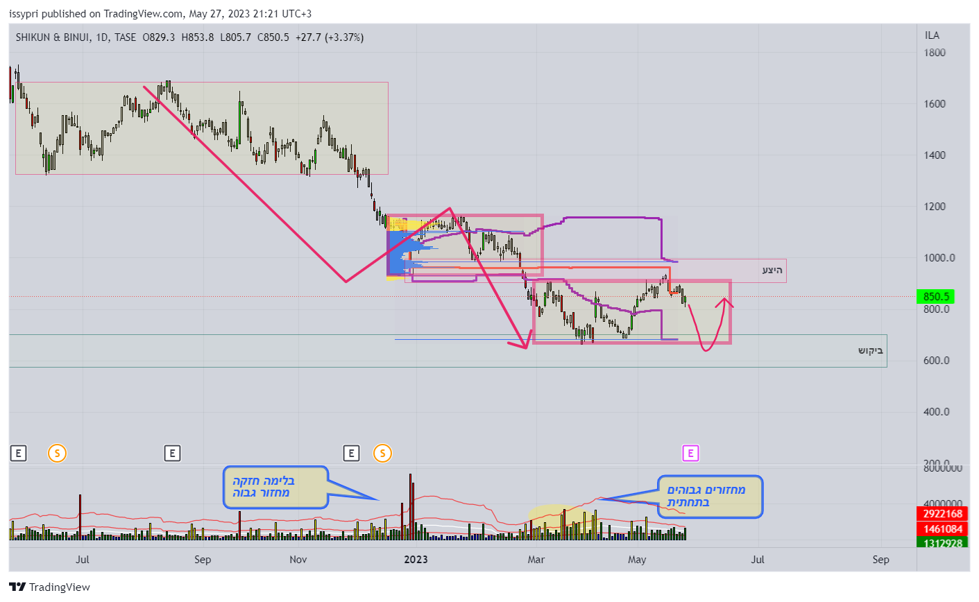 בטווח הארוך (לא בגרף) הגיע לאזור ביקוש. עדיין תחת מגמה יורדת. מחזורים גבוהים בבלימה ובתתחתית = עניין של קונים כרגע פאסיביים. צפי לקרוב - תנועה בטווח
