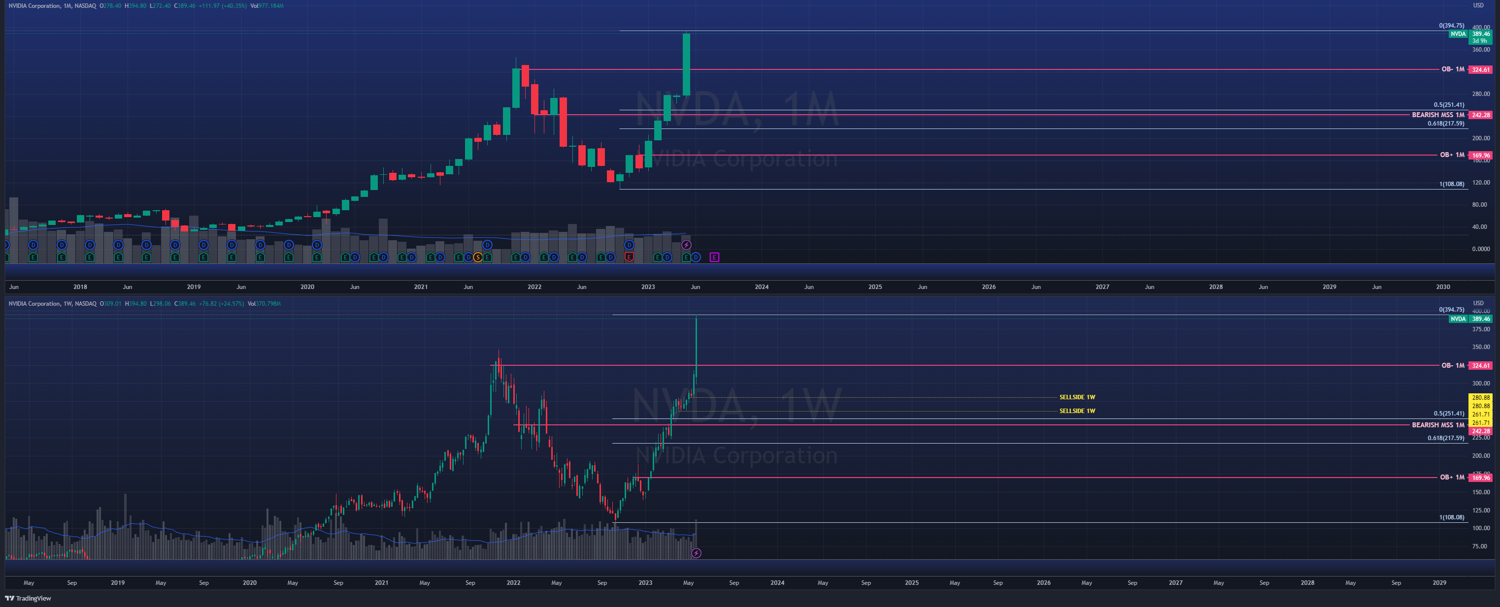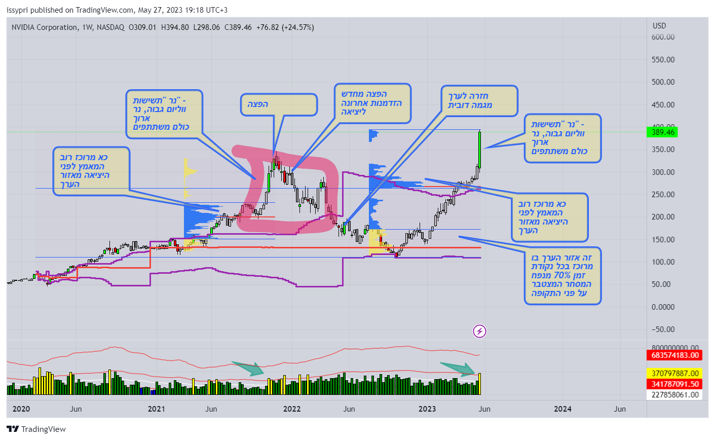 "תבנית הפצה" כרגע, על אף קווי דמיון מסויימים עם העבר. אני הייתי בוחר את לפרש את הווליום קצת אחרת. אסביר. אזור האינטרסים נמצא למטה, באזור "המאמץ", כדי לחזור לשם נצטרך קטליזטור כלשהו, והוא לא חייב להגיע. במילים אחרות, כל עוד לא צץ "ברבור שחור" (או שחור דהוי) המניה יכולה להמשיך במגמת לונג ארוכת טווח ורק אם יצוץ אז ה"שטח פנוי" עד אזור האינטרסים למטה, כי אין למעשה "תמיכה" אמיתית. ב2022, הריבית והביקוש לשבבים ירד דרמטית, AI היה כחלום רחוק וזה נתן קטליזטור לירידות, ובגלל שאזור האינטרסים היה למטה, המניה דיי החליקה לשם במהירות (עם תיקונים פה ושם). כרגע השוק שורי על המניה וזה יתמוך בה לתקופה ויתמוך בה תוך כדי אוורור ככה שיותר נקבל התכנסות או ירידה איטית בשלב הקרוב. התנודתיות הגבוהה שיורדת, גם תיצור טווח מסחר צר. שוק האופציות פתח עליה פוזיציות לונג למעלה, וספרי העושי שוק "לונג". אני צופה שהיא תשמור על האינטרסים שלה שמסומנים בגרף עם ירידה ל-324 בגלל הבריחה שעשתה שם לשורטים ארוכי טווח. במידה ותרד מתחת ויגיע קטליזטור מסויים, לא אשלול גם תיקון עומק לאזור 242.