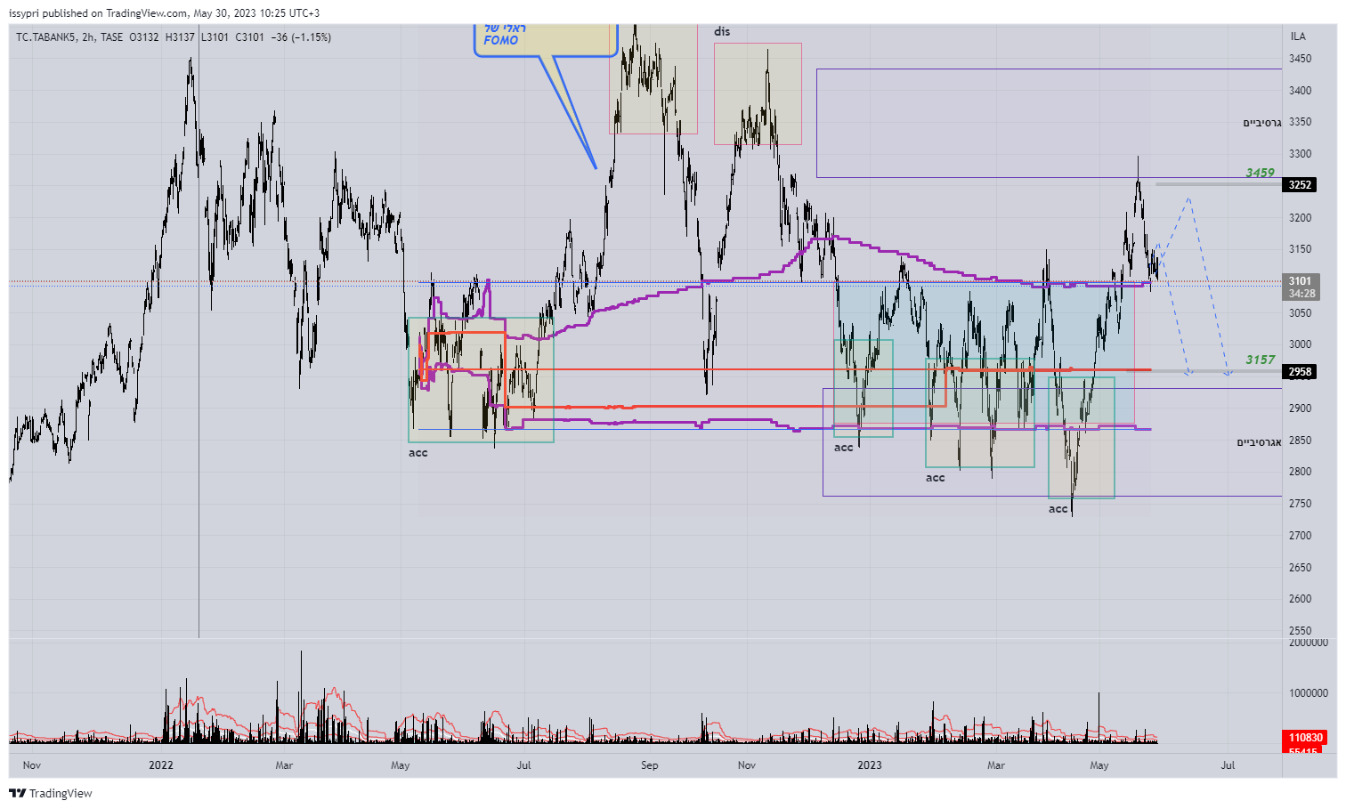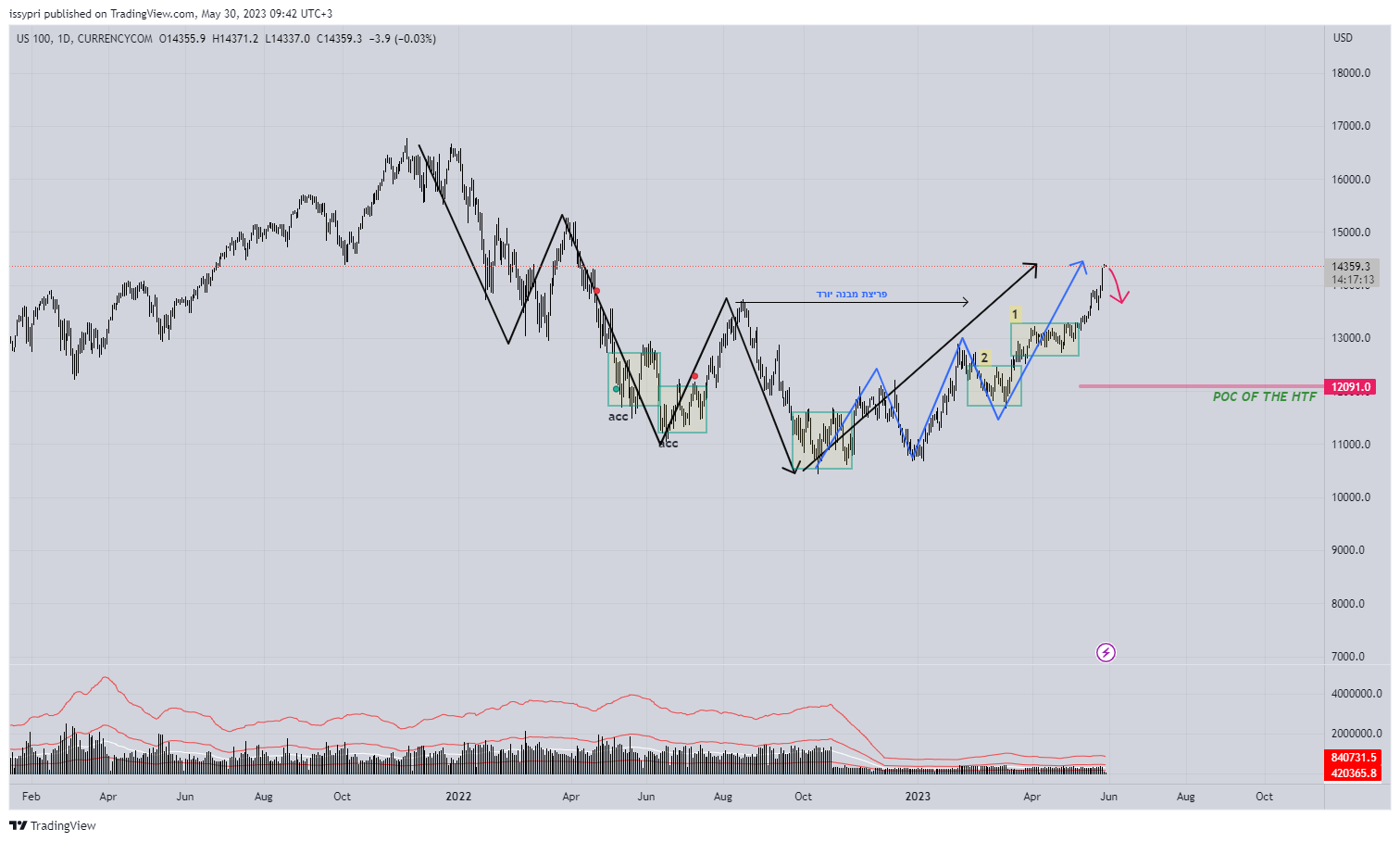 הסתכלות כללית על המדד 1. פרץ מבנה יורד (שחור), מבנה משני - כחול - עולה. 2. כרגע הPOC (POINT OF CONTROL) נמצא באזור 12100. עדיין באזור התחתון (מסומן 2) כדי לראות המשכיות של מומנטום צריך גם לראות שהערך (הסכמה בין קונים למוכרים) עולה יחד עם הPOC. 3. מהלך אחרון "נוסק" ללא ערך עולה יתקן בסבירות גבוה. 4. צפי לקרוב - תיקון. שלב ראשון אני רוצה לראות תגובה חזקה לאזור 13900. אני לא רואה את המחיר נוסק עוד הרבה למעלה.