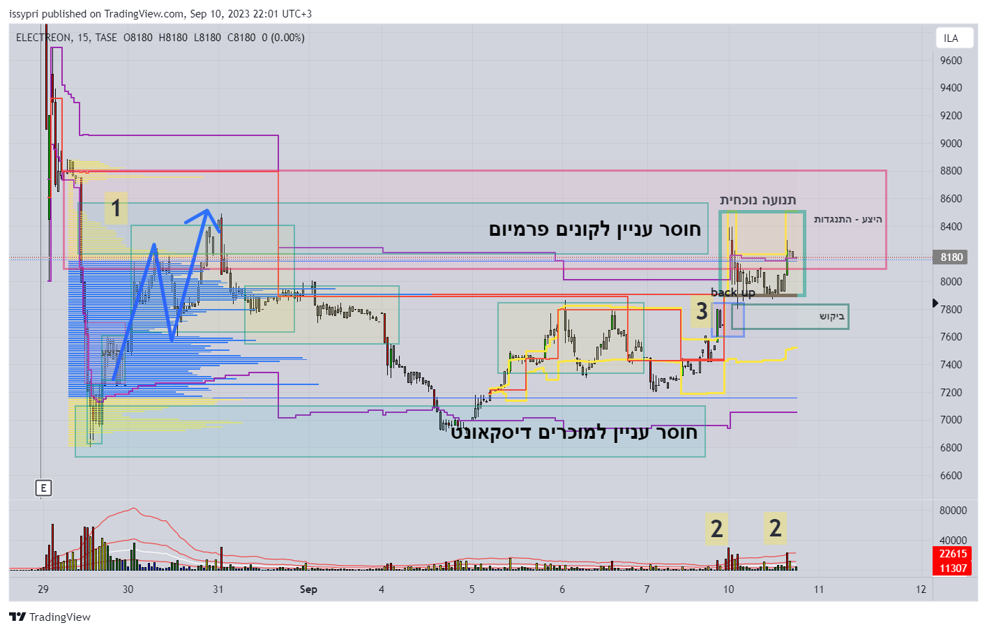 1 - אזור של חוסר עניין לקונים (עד כה) __________________________________ פרופיל הווליום מראה שבאזור הזה יש ווליום נמוך יחסית והמחיר כעת נמצא בשוליים של הטווח. הצבע הצהוב בפרופיל אומר שהווליום הזה חולק עם השוליים התחתונים, 30% מנפח המסחר של הטווח כולו. זה אומר שעניין לא נמצא פה. זאת הסיבה מדוע המחיר בד"כ נדחה מהאזורים האלו. המחיר פה יקר מידי לקונים והמוכרים ששמחים למכור פה ידחפו חזרה את המחיר לטווח ברגע שהקונים יגמרו. 2 - ווליום _________________ אנחנו נמצא את הווליום הגבוה מתחת לנרות שעלו לאזור ההיצע. נרות עם ווליום גבוה וזנב כלפי מעלה מספרים על מוכרים פאסיביים (לימיט) שנהיו קצת אגרסיביים בהמשך שנגמר מאמץ הקנייה. זה מעיד על האזור למעלה כאזור היצע. הווליום הגבוה גם מעיד על קונים אגרסיביים שרואים אולי את האזור הזה כהכנה לפריצה. 3 - הback up _______________ האוזן שדחפה את המחיר למעלה מאזור ההתכנסות הקודם, נקראת back up. בשפת וויקוף, ps של התנועה החדשה במקרה זה. זה למעשה אזור שיחשב לתמיכה זמנית שיחזיק את התנועה שנוצרה. ניתן לראות שהמחיר בולם סמוך, מעליו. שבירה של המקום הזה, תיתן אינדיקציה בסבירות טובה שהמחיר חוזר לטווח. אני אישית לא רואה את האזורים האלו כהזדמנות לונג. לרוב המחיר מפיץ פה וחוזר חזרה לטווח. לעיתים הוא פורץ שוב ואז חוזר. אם הקונים יהיו מספיק נחושים (נחושים = יסכימו להמשיך לשלם מחיר גבוה יותר), המחיר יפרוץ בראלי וימסד תנועת צד חדשה שלא תשבור את האזור הנוכחי. אם נסכם - המחיר נמצא בחלק היקר (פרמיום) של הטווח כולו. אזור זה הוא חסר עניין (עד כה לקונים). לרוב המחיר מפיץ פה וחוזר לטווח אם כי במקרים בהם הקונים יהיו מספיק נחושים ויסכימו לשלם מחיר גבוה יותר, הטווח יפרץ. צריך יהיה להבדיל בין פריצת שווא (שאין קונים שיחזיקו אותה) לבין ראלי ומיסוד טווח חדש.