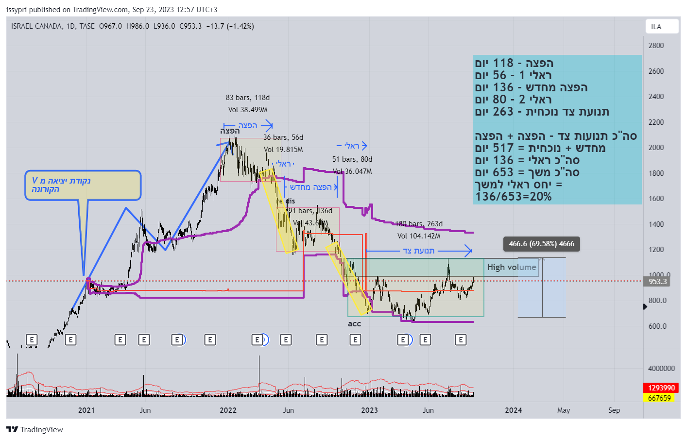 המניה תיקנה את הראלי מנקודת היציאה מV הקורונה ונמצאת כעת באזור דיסקאונט של הטווח כולו. תנועת הצד הנוכחית, שהתחילה כבר בסוף השנה שעברה ניראת כמו איסוף. הא אומנם מאוד גבוה באחוזים (כ 70 אחוז) אבל עדין תנועת צד כי היא למעשה נעה בתוך הגבולות שלה ולא מקדמת את המגמה. נתון מאוד מעניין אבל מאוד מאוד לא מפתיע זה יחס הזמן בין תנועות הצד למגמה האמיתית. היחס, 20 אחוז. למעשה את הדרך האמיתית מלמעלה למטה, עשו תנועות שהם רק 20 אחוז מציר הזמן. מסומנות בצהוב. אלו התנועות שכולם מחפשים לתפוס (במקרה הזה שורט) שלמעשה רוב הזמן השוק מניע אותנו הלוך חזור הצידה כדי לרוקן מאיתנו את הפוזציות. הפצה מחדש למשל מחדש היוותה תחנה של תקווה לשורים והשוק תימרן אותם כדי להכניס אותם לקניה במיני ראלי פנימי, מכר להם ובנקודה מסויימת המשיך למטה, לדיסקאונט. ההתנהגות הזאת זהה לכל הנכסים, מניות, חוזים, פורקס... לגבי קנדה, ניתן לנתח אותה ברזוצליה שעתית כדי לראות יותר פרטים לתנועה הנוכחית. הרצועה התכולה מלמעלה היא רצועת ההיצע של טווח התנועה. הדבר הנכון בעיני לעשות הוא לקנות בתחתית הטווח כמובן. הנסיון מלמד שרוב הסוחרים יקנו למעלה מתוך ציפייה לפריצה (תוך המצאת דגלים או תבניות שוריות אחרות שלא שייכות לסיטואציה). פריצה כזאת בהחלט אפשרית אך זכרו שהיא חלק ממהלך שקורה רק 20 אחוז מהזמן. אם היא תתרחש, מצטרך לחכות בסבלנות כי תנועות הביניים בירידה יאטו אותה וייצרו הזדמניות למבנים לכניסה ללונג.