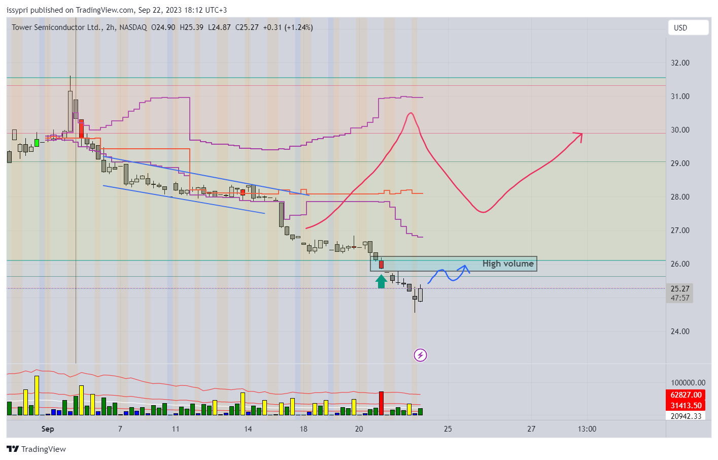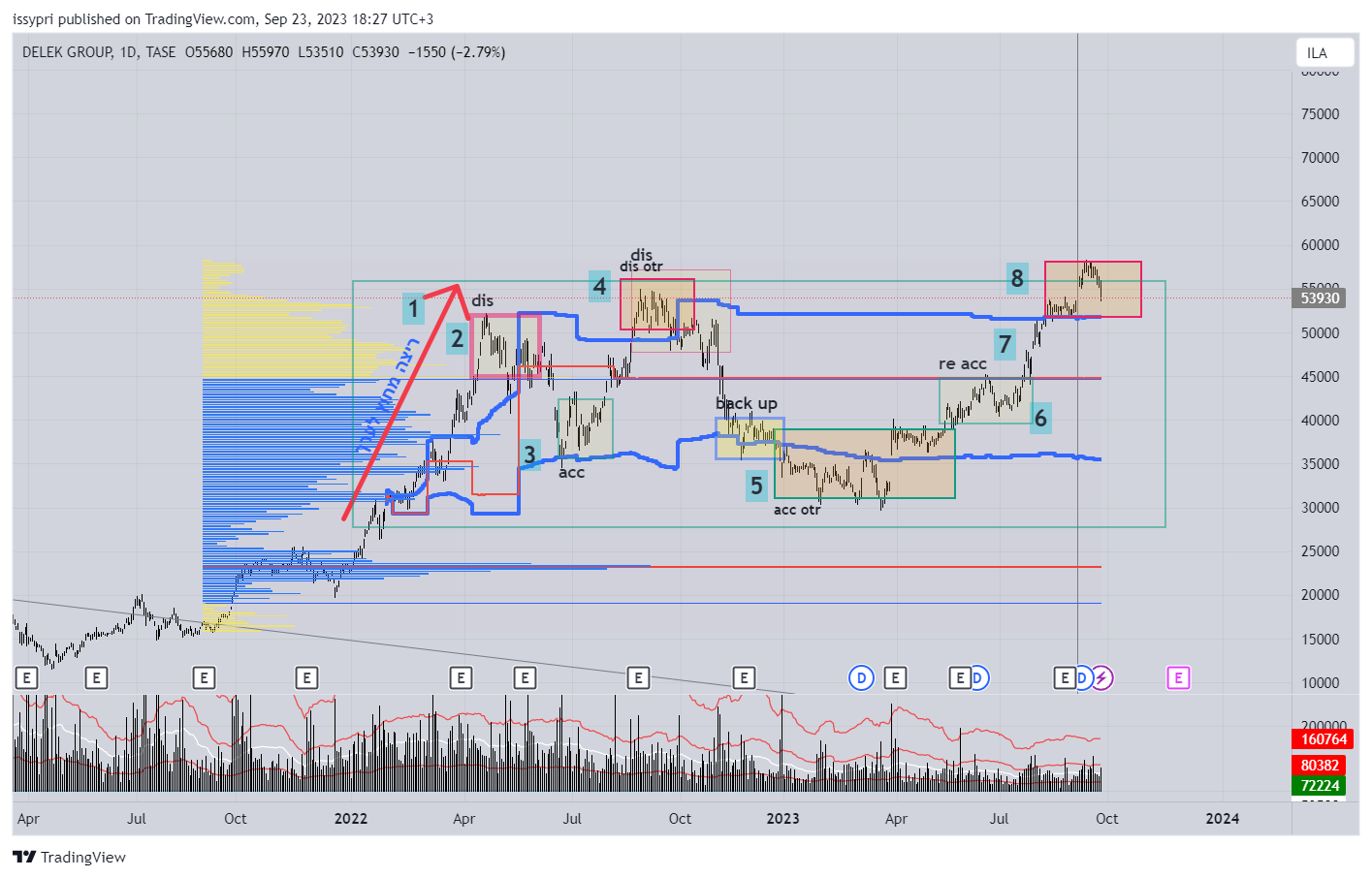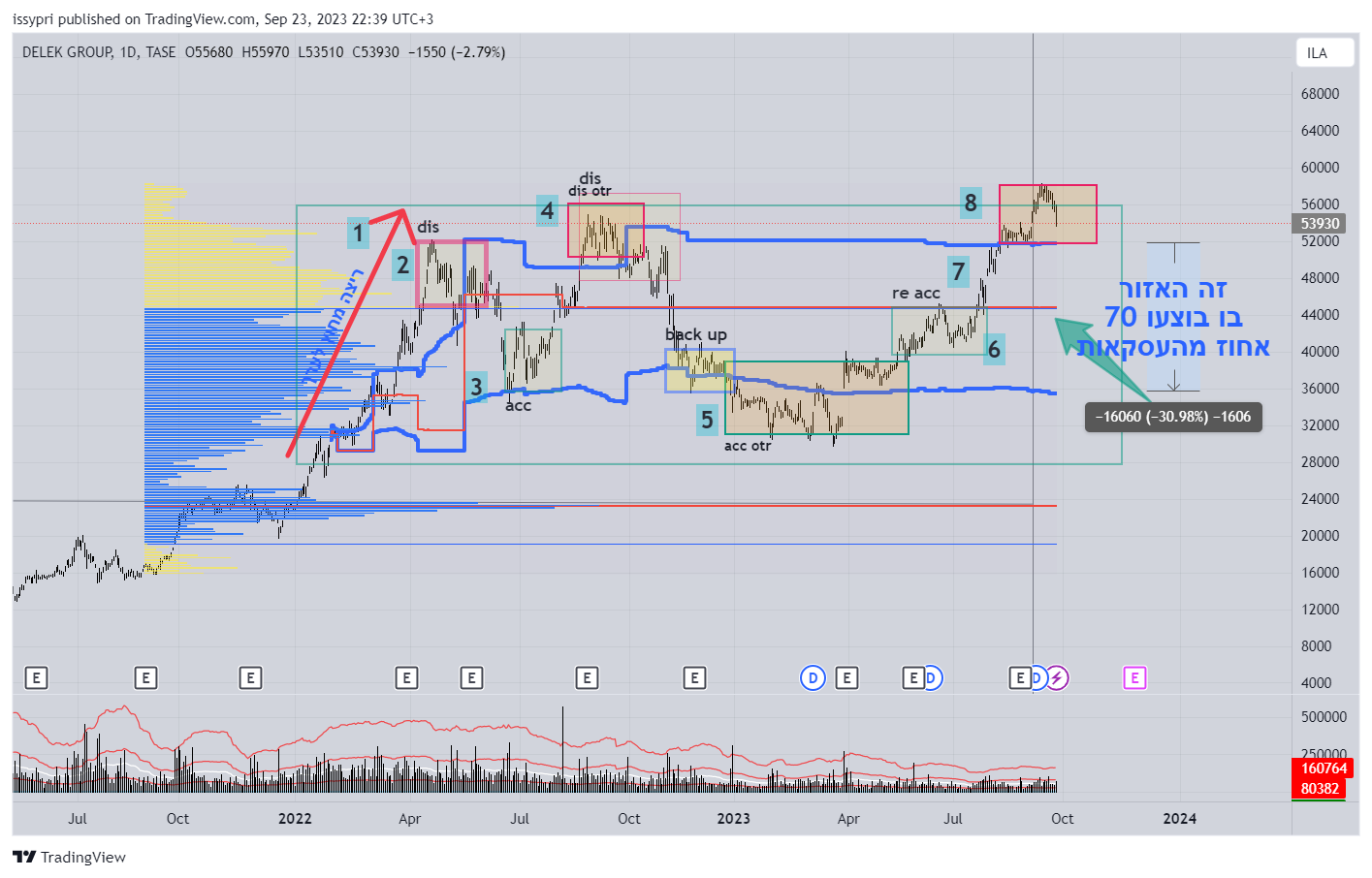 הסיפור אחורה לפי המספרים בגרף. 1 - ראלי. מסוגי הראלי שהמחיר בד"כ חוזר את רוב הדרך למטה. זה מה שהיה בסוף. זוית חדה , FOMO, ללא תנועות ביניים והכי חשוב - נכנס בחלק האחרון שלו לאזור חוסר עניין (בווליום הצהוב בפרופיל) 2 - אפריל 22 - הפצה. אני זוכר טוב את הזיהוי שלי ושל אחרים ומלחמת הפוסטים מול תומכי המניה. היה מעניין. 3 - איסוף בתחתית גבולות הערך. 4 - הפצה שאני קורה לה היום - הפצה מחוץ לערך. זו תנועה רחוקה מהשווי ההוגן שלה שבה כסף חכם מוכר לשאר פעם נוספת במחירים יקרים. 5 - איסוף מתחת לערך. בדומה להפצה מחוץ לערך זה מקום שרחוק מהשווי ההוגן - נחשב זול. פה הייתה טעות שלי. חשבתי שהמחיר יקח עוד לג לאזור 25000. (האזור עם הקו האדום בפרופיל) 6 - איסוף מחדש אחרי פריצה של ה back up. 7 - ראלי. זוכרים את ראלי 1 ? ... 8 - תנועת צד. כעת אנחנו שואלים - מה מפה. קודם כל זו תנועה מחוץ לערך. רחוק מהשווי ההוגן באזור חוסר עניין. כדי לקחת את המחיר לראלי נוסף, המניה זקוקה לקונים אמיתיים (זה לא אנחנו), גוף גדול אחד או יותר שיסכים לקנות הרבה מעל המחירים ההוגנים. אני באופי המסחר שלי, אוהב לקנות זול ולמכור יקר ומאחר וכרגע האזור הזה נחשב יקר אני מחכה. אם יפרוץ מחכים לו משמאל , אזורי מוכרים מהעבר ככה שיהמחיר לדעתי לא ימריא בכל מקרה. שורה תחתונה - המחיר נמצא רחוק מהשווי ההוגן, מחוץ לערך וסביר שיחזור אליו. אם אני טועה, פיפסתי ראלי אולי אבל הלכתי לפי הכללים שלי. נעקוב.