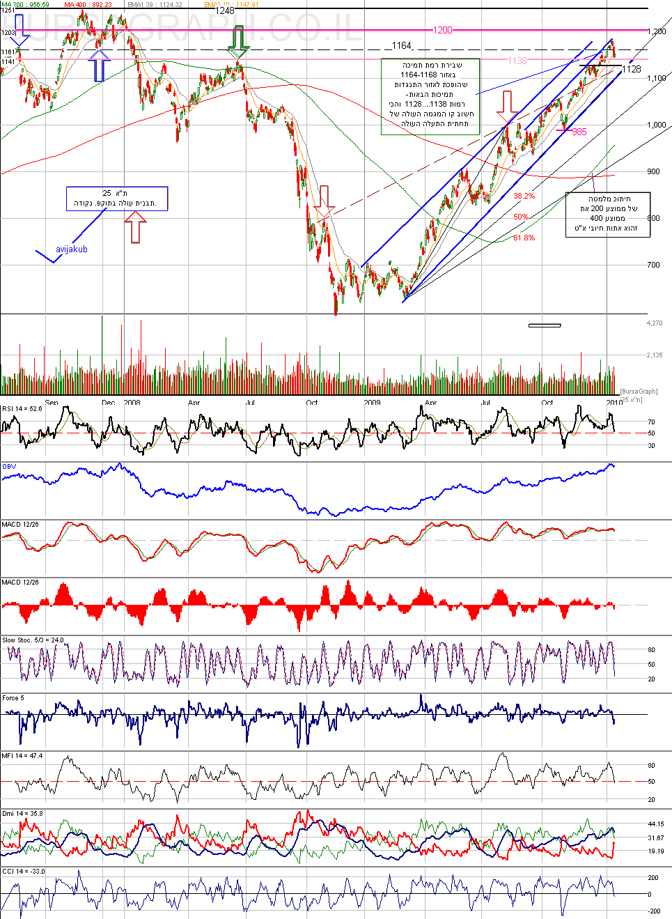 בהמשך לסקירה האחרונה........... יום מסחר בנטייה חיובית נסגר אתמול במדדי ת"א. מדד המעופ הוסיפ כחצי אחוז , מדד הבנקים עלה בדומה , ואילו מדדי הנדלן 15 והייתר עלו מעל לאחוז. מחזורי המסחר היו ברמת הממוצע התקופתי. טכני- ובכן אתמול מדד המעופ , מתקן משהוא ממהלך הירידות המינורי האחרון , כאשר בשלב זה רמת אזור 1164-1168 , מהווה התנגדות למדד. ואילו רמת 1138 מהווה תמיכה ראשונה . כל הנתונים הנ"ל , נמצאים בתוכ תבנית עולה ברורה בו נתון המדד בשלב זה , ואומר , המדד עדיין המהלך עולה ברור , וכמובן תוכ מימושים מינוריים עד להודעה חדשה. מבחינת התמונה הטכנית המלאה בשילוב הפוינט , אנו רואים המשכ תמיכה במהלך העולה בשילוב אתות עדיינ למימוש , עקב אינדיקטורים לטווח קצר- שבהיצע . כאמור רמת 1164-1168 מהווה התנגדות בשלב ורק פריצתה ישיב את המדד למהלך עולה גם לטווח הקצר . תמונת מתנדים- איטיים- RSI - עדיין תחת מהלך יורד -אולם מעל רמת האיזונ. MACD -רוחבי ומלווה באתות שלילי. מהירים במהלך איוורור , ושניהם מתחת לרמת האיזונ בשלב זה. PSAR - יורד....גם MFI שכבר מתחת לרמת האיזונ. ממוצעים 19\39 - עדיינ שוריימ......... בולינגר-- המדד נמצא ברצועה העליונה. לסיכום המתנדים אומר , כי כל עוד המדד ברצועה העליונה של בולינגר ובשילוב ממוצעים 19\39 שוריים , אזי המימוש בינתיים הינו מימוש מינורי בלבד , רק שבירת האינדיקטורים האלה ייתן אתות למימוש עמק יותר. פוינט- אתמול , מדד המעופ נותר לל"ש על הגרפ , כאשר נמצא בהיצע , אולם עדיינ תחת אתות חיובי . התנגדות על 1180 , תמיכה על 1150. אינדיקטורים- פרט לגרפ 10 שבועות שעבר להיצע , הייתר כולם בביקוש כולל המומנטום בשלב זה. איתותי מניות - רוב לשליליים. לסיכום- מדד המעופ , נמצא עדיין מתחת לרמות התנגדות לטווח המיידי שאותם שבר לאחרונה. בשלב זה כל עוד שהמדד נמצא מתחת לרמות אלה , ( 1164-1168 ) אזי הוא תחת השפעת המימוש המינורי עדיינ. ככלל ברור שהתנועה העולה הכללית -עדיינ בתוקפ , ובתבנית עולה ברורה. -עד להודעה חדשה. מט"ח- אתמול , יום פחות או יותר חציב בצמד אירו \ דולר שעדיינ נע סביב רמת 1.45 . אתות ברור סביר רמה זו ייתן את האות למהלך הקרוב לטווח הקצר. היינ היפאני נחלש אתמול מול הדולר וכאנ הוא עדיין תחת השפעת ההתחזקות של הימים האחרונים. ,וזו גם המגמה לטווח המיידי בינתיים. סחורות - נפט- נע סביב רמת 80 דולר , ועדיין תחת מימוש לאחר שהגיע לאחרונה להתנגדות באזור 83. זהב - עדיינ תחת תיקון עולה , וכעת ברמת 1142 , ככלל , כל עוד שמתחת לרמת 1180 , אזי תנועתו היא כלפי מטה בתור מגמה. בורסות חו"ל- יום מעורב בנטייה חיובית......אתמול................. מזרח - נטייה לירידות שערים........ אירופה-עליות קלות עד לחצי אחוז......... ברZיל - עלתה כחצי אחוז............. ואילו ארה"ב - סיימה בעליות של כ-4\3 אחוז בממוצע ( הרחבה בהמשכ ).... בפתיחת המסחר כעת במזרח נוטים המדדים לעלות כ-4\3 אחוז בממוצע....... דולר נחלש מעט מול האירו....יינ יציב מול הדולר. יום מוצלח לכולמ\נ.....................😃