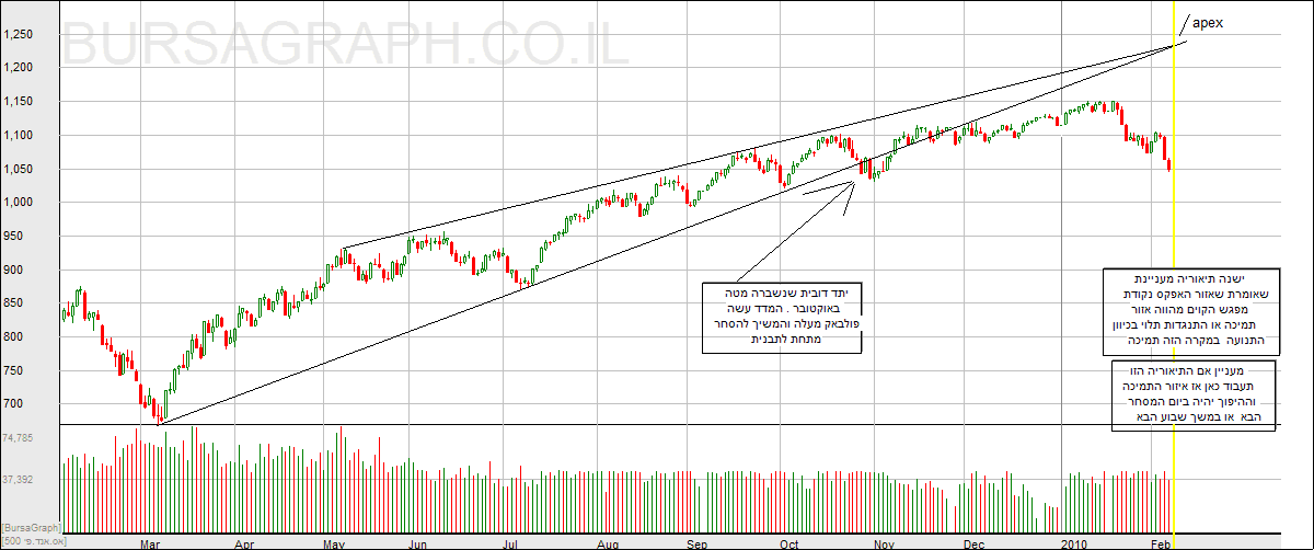 לא קורא את ההודעה עד הסוף. הרי ברור שהתבנית הזו הסתיימה והיא נשברה באוקטובר. העליתי כי אחרי שבירה עם התקדמות הזמן בנקודת המפגש של הקווים באפקס נהיה איזור תמיכה או נקבע שפל. כך לפחות מראה התיאוריה ןהסטטיסטיקה. ומה לעשות נקודת המפגש תהיה ביום המסחר הבא וככל הנראה יהיה שפל אחרון.