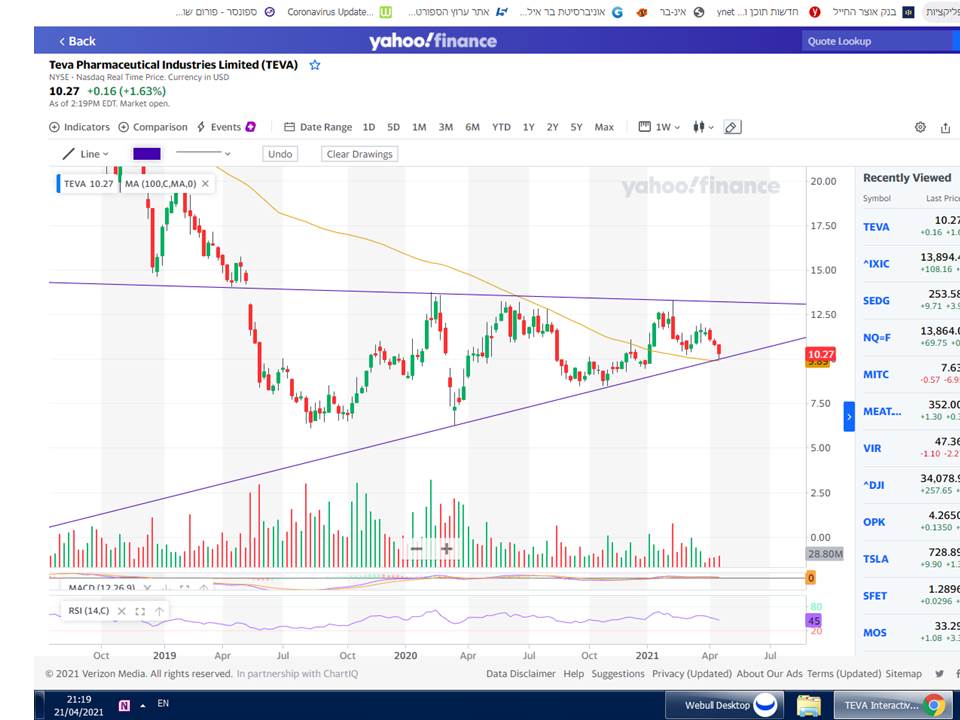 ממוצע נע 100 בגרף שבועי ובתוך תבנית שפריצה שלה תתן יעד 20 דולר!!!! חזון למועד אבל בגרף שבועי נראית סהכ חיובית למרות הירידות המפחידות בימים האחרונים