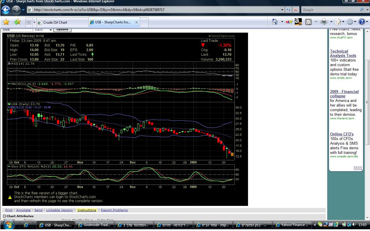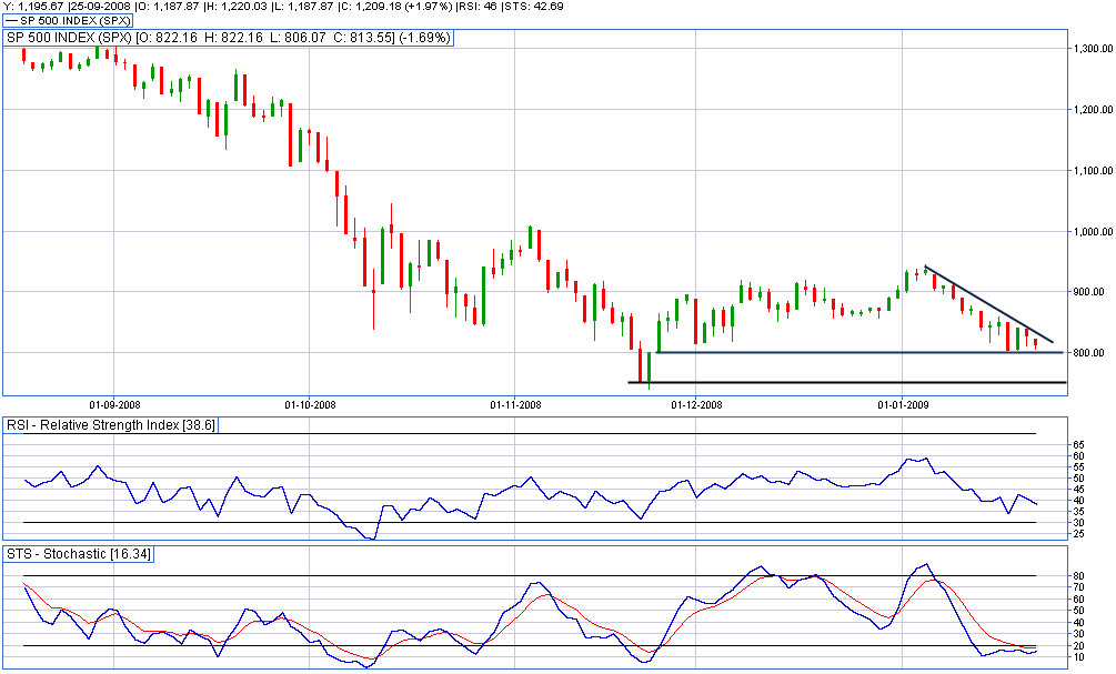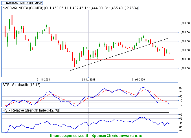 או ששוק המניות האמריקאי מסוגל לא לשבור את התחתית בו המדדים היו בחודשים אוקטובר נובבמבר 2008 נתוני המקרו והדוחות הכספיים הגרועים מצדיקים ירידה של 25% נוספים במדדי המניות ב"שקט". נקווה שזה לא יקרה והשוק יחזיק מעמד אם אכן תהיה צניחה נוספת הרי שאולי אחריה תבוא העדנה או לפחות הרגיעה. לגבי השוק בארץ זה בלוף אחד גדול ובטווח הבינוני והארוך הוא יתאים עצמו לשוק האמריקאי ולשוקי אירופה עקב לצד אגודל. נקווה שיהיה היום היפוך ונסגור בירוק חזק אמן