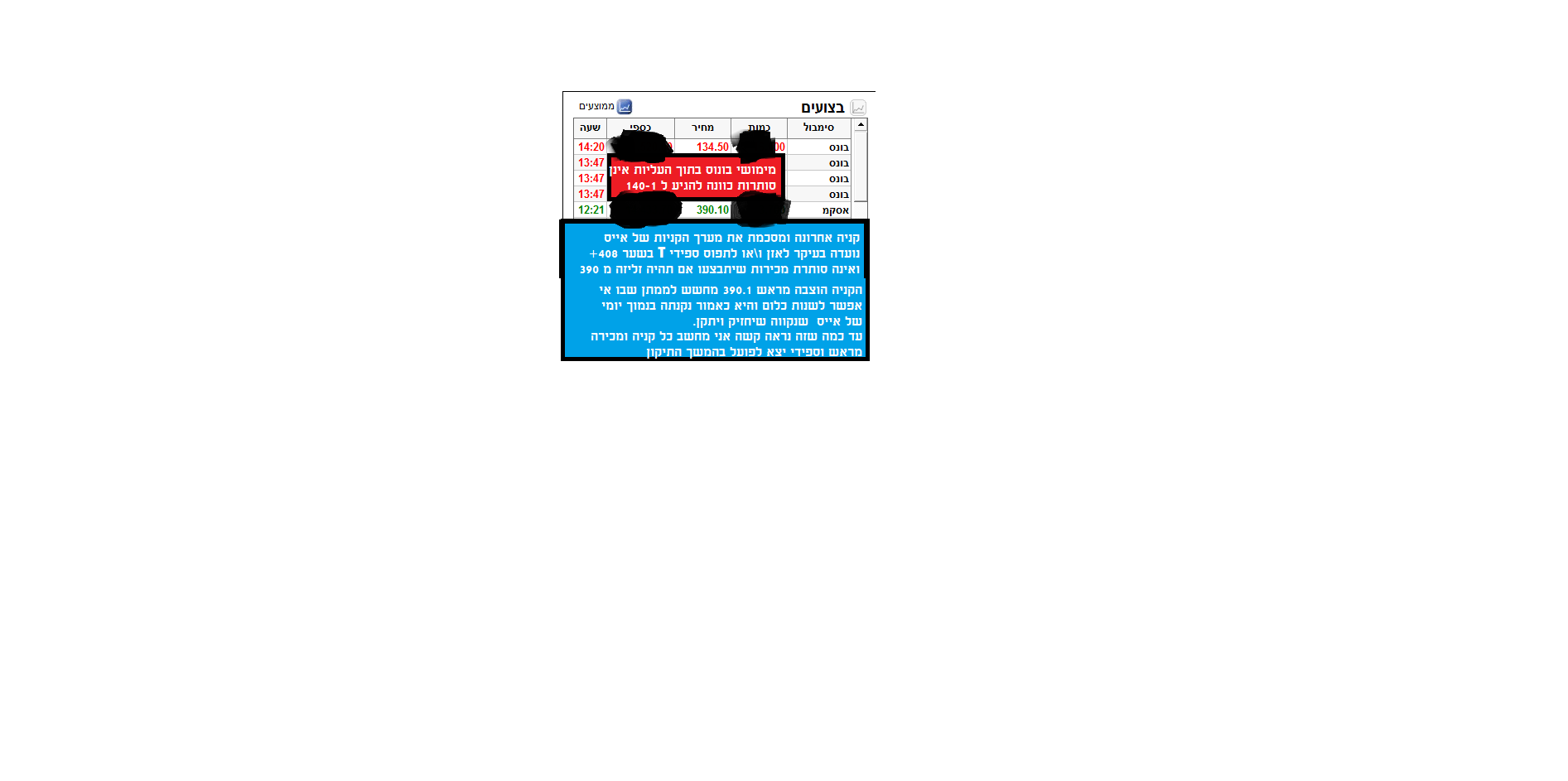 שקניתי בו היום ויש תיעוד זה קרה ב 12:21 נמוך יותר לא אקנה בשלב זה מה זה קו אדום 390 עבורי ? כל ירידה מתחת לקו זה תגרור אחריה מימושים מצידי והקטנה נוספת של האחזקה כי יש לי פיפו למימוש ברווח שאני לא רוצה שהוא יתפספס . אחרי המימוש אם הוא יגיע ברור שאתחיל בסדרת קניות חדשה כדי לאזן שערי פיפו שנקנו גבוה יותר ואני עדיין מחזיק בהם. זה בערך העניין מה שטוב עבורי אולי לא משרת אחרים הכל היה ,מתחיל, ונגמר בשערי הפיפו. ואני לא רוצה להיכנס ולחשוף יותר מזה כרגע מצ"ב קניה אחרונה ומסכמת של אייס בנמוך היומי שלה 390.1 והמשך חלק 3 מכירות בונוס סביב 135 שלא סותרות את כוונתי לממש כמו בבוקר באיזור 145 אם יחזור . (דבר אחד בטוח בונוס אותי לא תתפוס עם המכנסיים למטה) כבר מוצבים סטופים נמוכים כמו מימוש גבוה ההבדל אצלי נובע מכך : שרוב המשקיעים נכנסים פעם אחת או שניים למניה וקונים כמות מוגבלת אני כשמזהה מקום להתחפר בו אני קונה בשלשות ומוכר אח"כ כדי לקנות שוב וזה בדיוק מה שאני עושה היום ב 10:19 העליתי צילום מסך של מכירה בונוס ב 145 מאז קניתי שירדה הגדלתי כמות ועכשיו מצאתי לנכון לשחרר חלק מהנרכש היה והיא תעלה ל 141 או 145 נראה שחרור נוסף היה והיא תרד מתחת ל 129 נראה קניות נוספות אני לא יושב ומסתכל על השער אני מראש קובע מה אני רוצה להשיג.