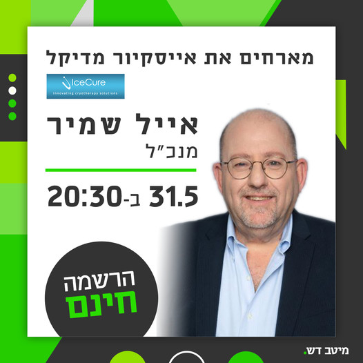 IceCure Medical 5 שעות · רק ב-31.5 בשעה 20:30 שיחת זום שהיא חובה לסוחרים בבורסה עם האורח אייל שמיר, מנכ"ל אייסקיור מדיקל. ההשתתפות בחינם לסוחרים בבורסה, מהרו לתפוס מקום >> http://ow.ly/EB3j50EWdli מיטב דש
