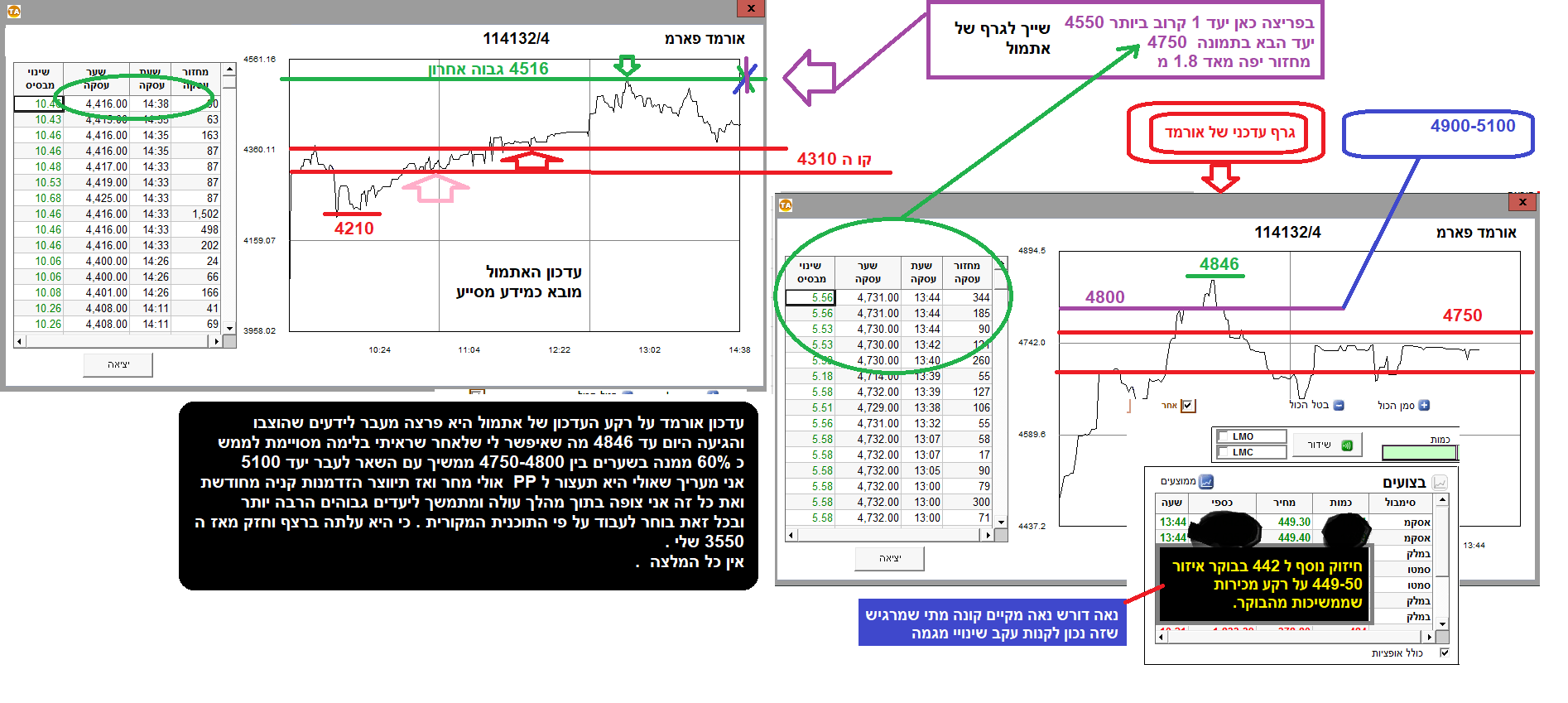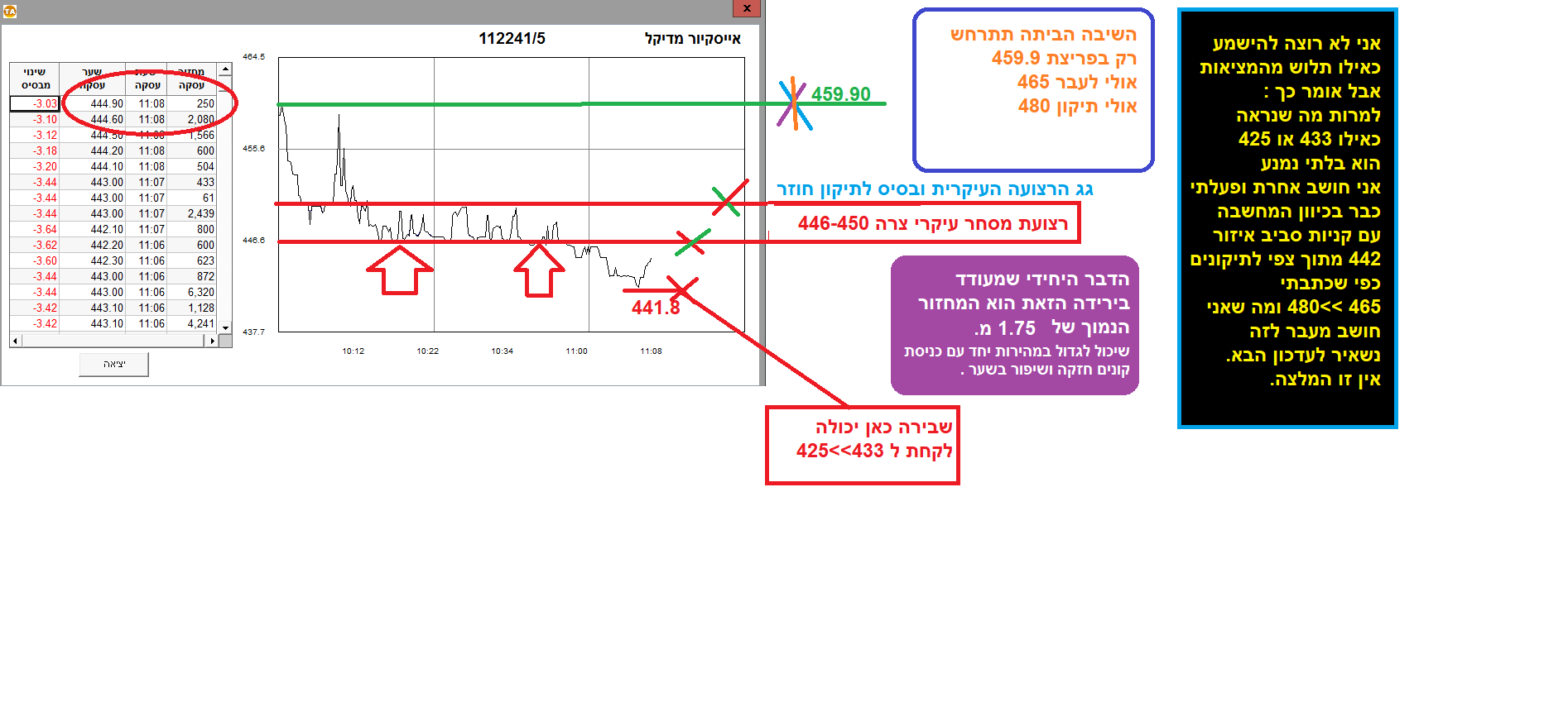 כל יום את השאלה הזאת היכן כדאי לקנות ? תסתכלו טוב על הגרף בעדכון וחפשו את רצועת המסחר העיקרית אני לא סתם מסמן אותה כי אני ממתין תמיד לזליגה מתחת לרצועה כמו שמופיע שם לעבר 441.2 ואז אני מקבל איתות מכדור הבדולח לקנות הקיצר וזו לא המלצה אך קניה מתחת לרצועת המסחר השולטת נכון לאותה נקודת זמן היא המיקום הטוב לקניה ועוד נקודה חשובה למי שעוקב תמיד בעדכונים שלי אני רושם או רצועת מסחר קודמת או רצועה 1 או 2 ומדוע ? כי מעדכון לעדכון יש שינויים ברצועות המסחר העיקרית ואני מסתמך עלפיה כדי למכור או לקנות או לפעמים למקסם רווח ע"י קניה אל תוך העליה של אותה רצועת מסחר