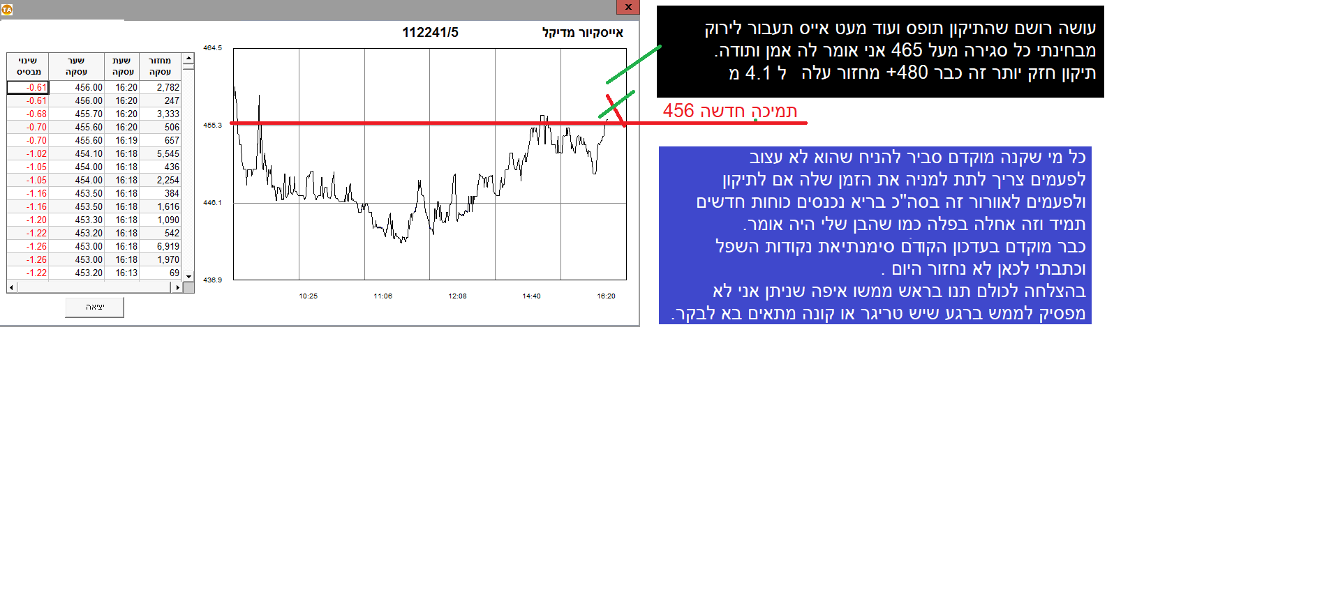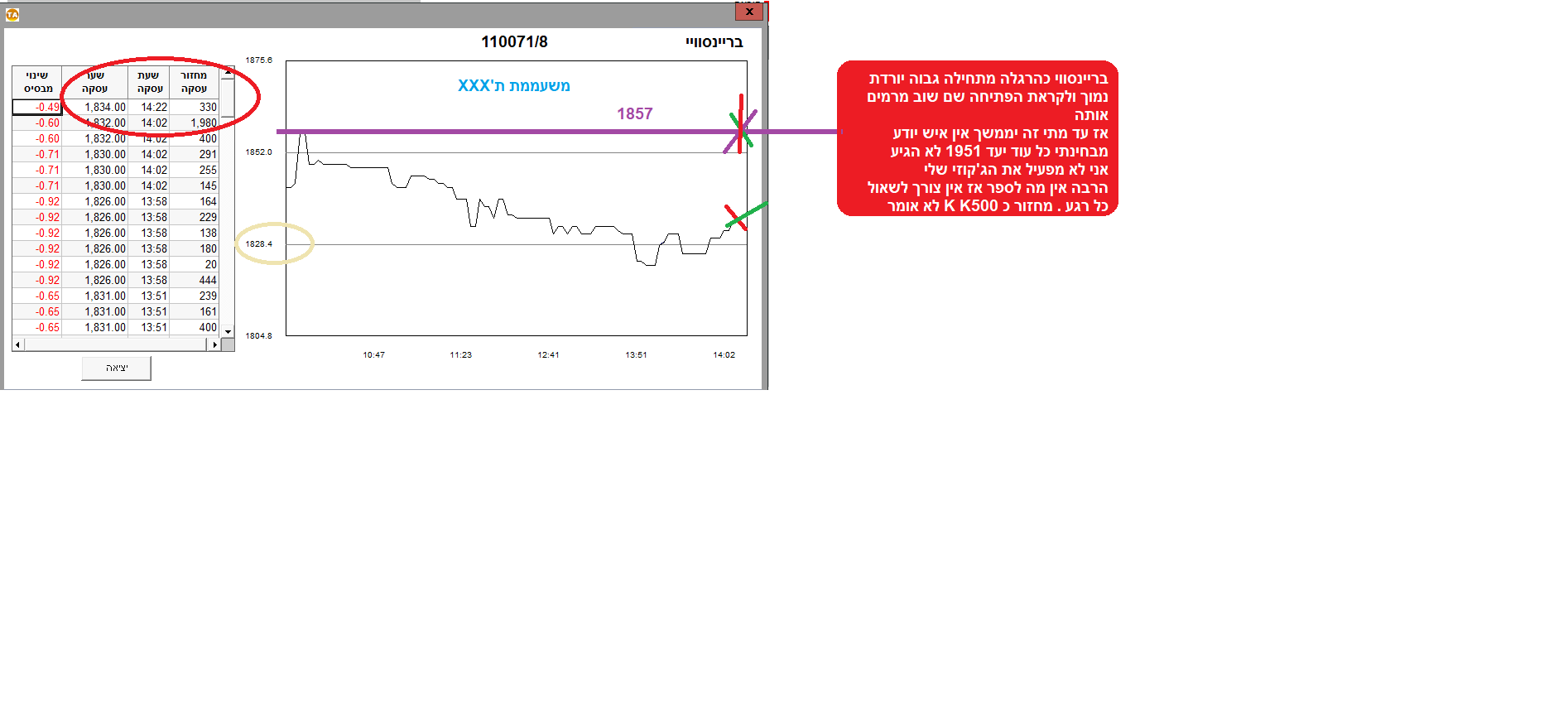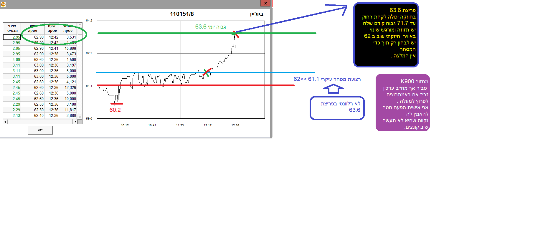 מעדיף אותה למעלה אבל לא נבהל אם היא יורדת אחרי שמכרתי בגבוה אתמול וזאת הסיבה שאני קונה רק שליש ולא את כל הכמות הנמכרת ביום מכירות כדי שיתאפשר לי לקנות שוב בירידה נוספת. אין הוקוס פוקוס עבד השם . אבל וזכור זאת לא משנה מתי תמיד אעדיף אותה למעלה ככל הניתן( כדי למכור גבוה.)