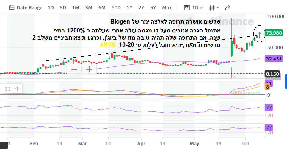 פרצה אתמול קו מגמה עולה! בילתה מעליו גם שלשום - היום בו הודיעו על אישור התרופה לאלצהיימר של ביוג'ן. ממליץ מאוד לקרוא עליה. תחום שהולך וצובר מומנטום גדול. פטיש ירוק לאנוביס מעל הקו העולה בזמן שביוג'ן צוברת ערך של עשרות מיליוני דולרים עם תרופה שבקושי עובדת. לעומת SAVA שכבר שווה מיליארדים, ANVS עדיין בשווי של מאות מיליונים ומטפסת מהר. הצלחות לכולם!