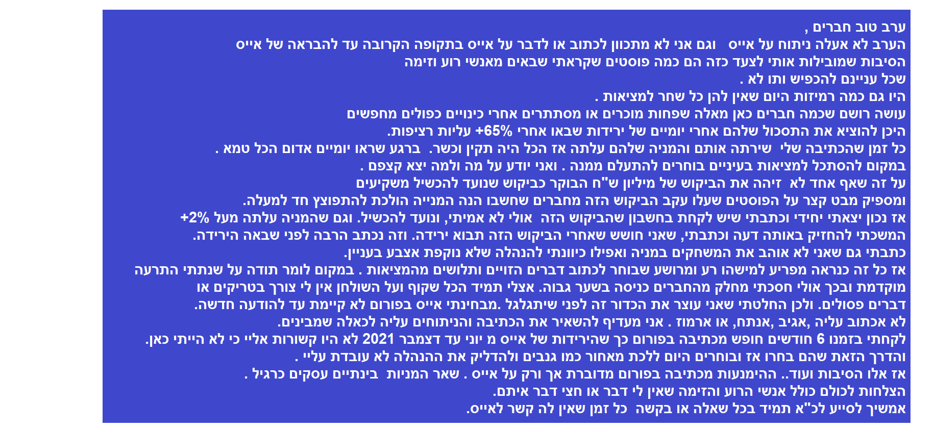 למניות שונות אתה שנתיים אומר סבלנות באינטרקיור ומאז לא קרה כלום עכשיו אתה מתחיל לדקלם על אייסקיור סבלנות תרד מזה אנשים צריכים 200% לחזור לקרן במניה שחרר את אייס