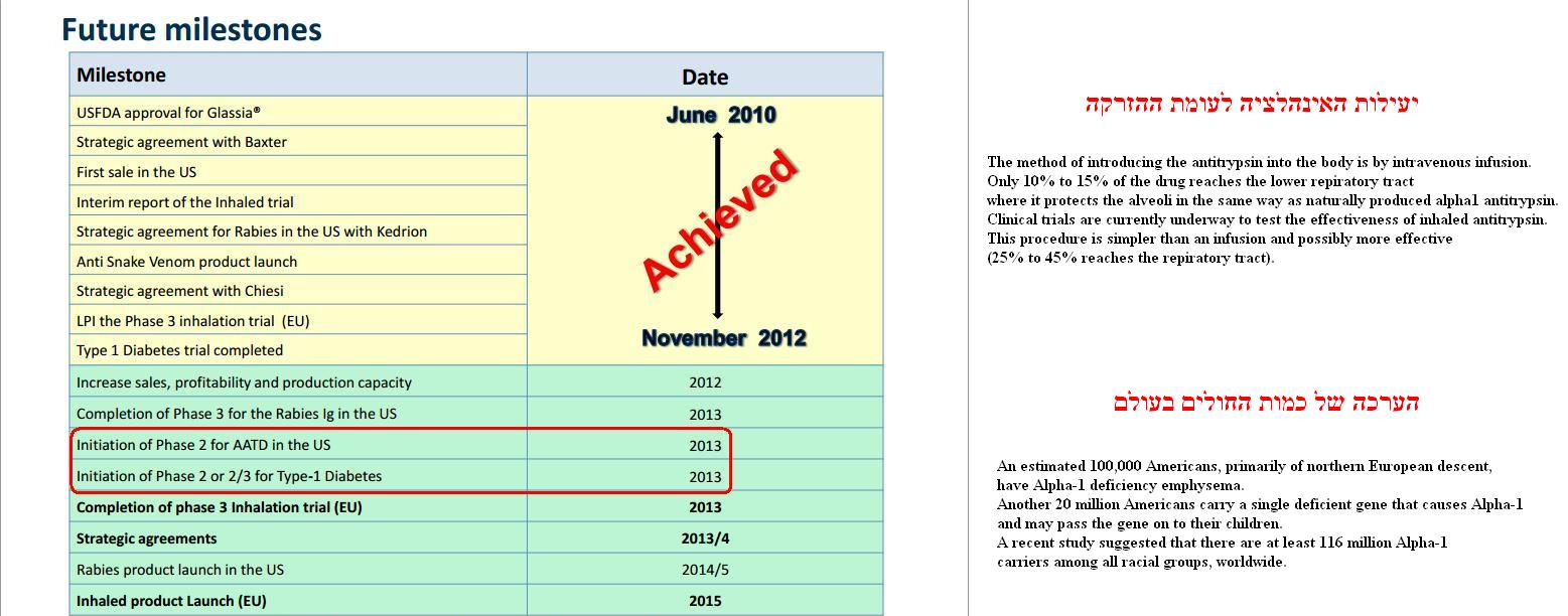 ראשית מצ"ב קובץ עם 3 דברים שונים! שאלה ראשונה - נעלם לי נושא "תחילת הניסוי Phase2/3 של Kedrion בחיסון לכלבת " האם הוא החל כבר ? אני זוכר שהתכנית הייתה להתחיל אותו בסוף 2012 ? שאלה שניה - יש לכם הערכה לסכום הכסף הנדרש לשני הניסויים המתוכננים השנה ? כפי שמופיעים בשקף מהמצגת ומסומנים בריבוע אדום ? ההשערה שלי - 50 עד 60 מליון דולר, אבל אני לא בטוח בעיקר בגלל אופי הניסוי הראשון, דעתכם ? לגבי 2 הציטוטים האחרים שבקובץ: 1. מימין למעלה ולדעתי החשוב ביותר - יעילות האינהלציה על פני ההזרקה 2. הערכת מספר החולים בעולם לא משהו חדש שלא ידענו, סתם תזכורת חשובה בעיקר לנושא הראשון יום טוב וחמים ובהצלחה לכולם 👍🌹