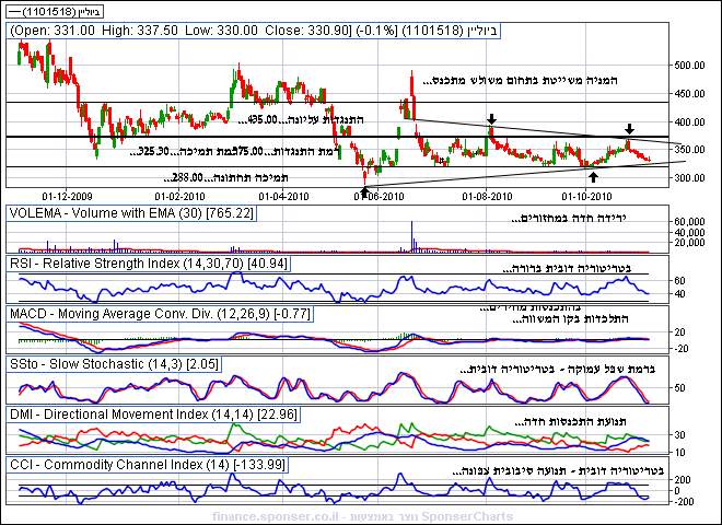 ירידה חדה וחריגה במחזורים...המניה נמצאת על סף שבירה/בדיקת רמת תמיכה אופקית הממוקמת בשער...325.30 הקרובה כל כך לשער נעילה...330.90... המניה משייטת בתחום משולש מתכנס - ורק יציאה מאחד מקווים מקבילים אלה יתנו כיוון לאן פני המניה מועדות... בשלב זה מצב של דשדוש וחוסר מגמה נמשך...❓ בסיכום שבועי ירדה המניה בכ - 3.44% -...⬇ מתחילת שנת 2010 ירדה המניה בכ - 9.84% -...⬇ 🤞🚬