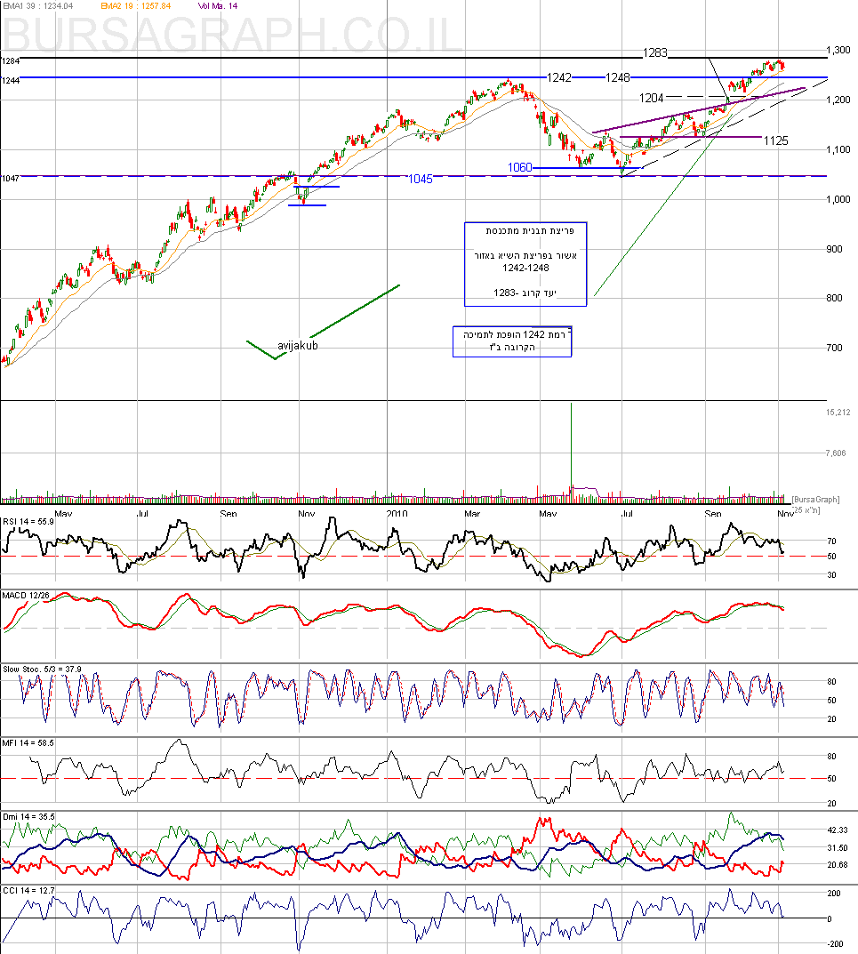 ...בהמשכ לסקירה האחרונה............. יום מסחר בנטייה חיובית ננעל השבוע שהסתיימ בחמישי האחרון , במדדי ת"א. מדד המעופ הוסיפ כרבע אחוז מדד הייתר 50 עלה כחצי אחוז , נדלן 15 נותר לל"ש ואילו מדד הבנקים עלה כ-2 אחוז. מחזורי המסחר -מעל רמת הממוצע התקופתי. טכני- כידוע מדד המעופ , עדיין נותר תחת אתות חיובי , ובמהלך עולה , אולם לאחרונה הוא נע רוחבית בין תמיכה חשובה לרמת היעד שנקבע. כלומר בתחום- 1283-1242. תחום זה הינו טווח שביציאה ממנו יתקבל אתות חשוב כהמשך לתנועה לטווח הקצר. בכל מקרה , התנועה העולה הכללית נותרת בתוקפ , כל עוד המדד נותר מעל קווי תמיכה עולים - סגול וקו מקווקו כנראימ על הגרפ המצ"ב. תמונת מתנדים בגרפ יומי מעופ - איטיים- RSI - עדיין תחת מימוש אולם נותר מעל רמת האיזונ , נטייה למהלך רוחבי ב"ז. MACD - באתות שלילי. מהירים- בתנועת מימוש בשלב זה. ממוצעימ - 19\39- עדיין תחת מהלך עולה \שורי. בולינגר- המדד נתון ברצועה העליונה.. PSAR -עולה...MFI - מעל רמת האיזונ. תמונת הפוינט- מדד המעופ נותר תחת אתות חיובי , ונמצא בביקוש. נמצא על תקרת טווח המדידה וביעד ברמת 1280. אינדיקטורים- המהירים , כלומר גרפ 10 שבועות והמומנטום נותרים בהיצע....כל הייתר בביקוש. -חלקם ברמות גבוהות. איתותי מניות - מעורבימ. לסיכום- מדד המעופ נותר תחת אתות חיובי , בשלב זה ומגובהה ע"י התמונה הטכנית הכללית. לטווח הקצר , התנועה כאמור רוחבית צרה , ואתות לכיוון ההמשכי נקבל ביציאה מתחום הטווח כמוסבר לעיל. מט"ח- האירו נחלש מול הדולר , בשישי האחרון , אולם עדיין התנועה הינה של התחזקות האירו..כאשר רמת1.39 הינה התמיכה הקרובה החשובה ואילו היעד על רמת 1.47. היינ היפאני נחלש מול הדולר אולם עדיין מתחת להתנגדות חשובה על 82 יינ לדולר. סחורות - נפט- על רמת 86.8דולר ועם יעד על 93 דולר בשלב 1. תמיכה קרובה על 84. זהב - תנועה עולה ארוכת טווח בתוקפ ועם יעד על רמת 1450 דולר לאונקייה....כעת ברמת מחיר של-1397. בורסות חו"ל- יום בנטייה חיובית בשישי........ מזרח- עליות שערים ...כאשר בלטה יפאן בעלייה חדה. אירופה- נטייה ליציבות , ולשינויימ קלימ ברZיל- ירדה כחצי אחוז ואילו ארה"ב - עלתה כרבע אחוז..........( סקירה מורחבת עלתה בשבת כאנ בפורום , )... אזכיר כי ביום חמישי האחרון-המדדים בארה"ב עלו כ-2 אחוז......... יום מוצלח לכולמ-נ.............😃