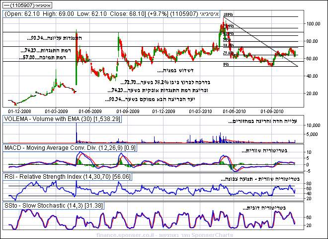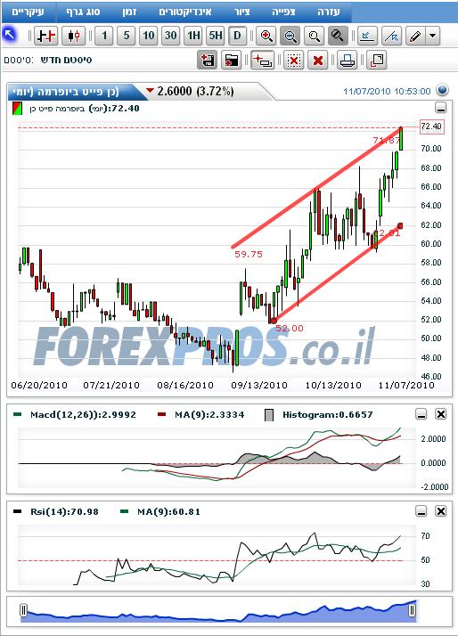 עלייה חדה וחריגה במחזורים במניה שנחתכה לאחרונה עד לשער...61.00 לערך ופניית פרסה צפונה במחזורים ערים עד לשער נעילה...68.10... פריצת פיבו 38.2% בשער...72.70 יקרב אותנו לניסיון פריצת התנגדות אופקית סמוכה הממוקמת בשער...74.23... בסיכום שבועי ירידה מינורית במניה בכ - 1.30% -...⬇ מתחילת שנת 2010 לעומת זאת עלתה המניה בכ - 17.41% +...⬆ 🤞🚬