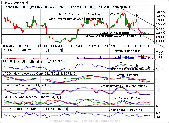 ירידה חדה במחזורים...מומנטום שלילי...חמשת ימי המסחר האחרונים בו ירדה ברציפות המניה רק מחזקים את שנאמר כבר מזמן על המניה שממשיכה לאבד גובה ולהחלש... בגרף שבועי המניה משייטת בתחום תעלה יורדת דרומה - שברה רמת תמיכה אופקית בשער..1801.00 שהפכה לרמת התנגדות... מתנדים בטריטוריה דובית מובהקת - וירידה חדה במחזורים מאותתים גם כאן על חולשה... למרות כל האמור לעי"ל ומתוך הכרה של ציבור המשקיעים - אוהבי תחתיות וסיכונים עשויים למצוא כאן כר נרחב לפעילות - לסיבובים יומיים...( הסיכון למהלך כזה ידוע...!!! )... בסיכום שבועי נחלשה המניה כשאיבדה כ - 8.19% -...⬇...מערכה... מתחילת שנת 2010 ירדה המניה בכ - 29.89% -...⬇ 🤞🚬