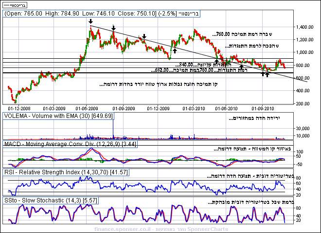 ירידה חדה וחריגה במחזורים...מומנטום שלילי ביותר...רצף של 4 ימי ירידות... המניה נגעה באיזור שער 900.00 - לא צלחה בפריצת נקודה זו והחלה לגלוש דרומה... שברה רמות תמיכה בשערים...840.00...ו - 760.00 שהפכה לרמת התנגדות... רמת תמיכה חדשה מוקמה בשער...682.00... המניה נתמכת בשלב זה בקו תמיכה ארוך טווח חוצה גבולות היורד דרומה... חולשה במניה... בסיכום שבועי ירדה המניה בכ - 7.84% -...⬇ מתחילת שנת 2010 ירדה המניה בכ - 18.74% -...⬇ 🤞🚬