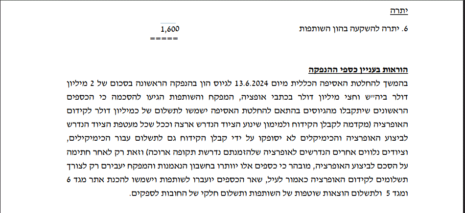 חוויה קצת קשה הדומה לסיור ברצועה סה"כ ההפסד כ 5 מיליון $ ל 181 ימים או כ 95 אלפי ש"ח ליום ... סה"כ ערכי נכסי הנפט מורכבים למעשה ממגד 5 המופחת בכל שנה ו על פי התקנו גם "כל ההוצאות שהוצאו בחיפוש נכס נפט, כולו או מקצתו, לרבות הוצאות לבדיקות וניסויים גאולוגיים, גאופיזיים, גאוכימיים וכיוצא באלה " אז למה לא רואים את העליה בנכסי הנפט בגין הדוח המפואר של שלומברגר שהיה בסיס להגדלת ההון באסיפת 6/24? ואם תרצו לאן נעלם פאר היצירה = מגד 6 שגם בדוח זה קיימת לו עדיפות על מגד 5 שכן יש בו מרפסת המאפשרת לגלוש פנימה מעומק של 4200 מ' והכי חשוב ציטוט "הקיטון בהוצאות נובע מהפסקת הפעילות עד להשגת הציוד והמימון הנדרשים". אם הפסקת הפעילות אז למה יש הוצאות?? ואם כבר משוים לשנה קודמת בה בוצעה פעילות כושלת לאחר גיוס הון של 1.3 מ' ש"ח ראה הודעה מ 24.1.2024. דמי ניהול ראוי להדגיש את האמור בדוח 2024( ציטוט ) "החל מחודש אוגוסט 2023 השותפות אינה מפרישה ואינה משלמת את דמי הניהול מכיוון שהם כפופים לאישור האסיפה הכללית בכל שלוש שנים )האישור האחרון הסתיים בחודש אוגוסט 2023( וטרם הובאו לאישורה.) להזכיר כי מדובר באותם 22 אלפי $ מהם משולם שכר הדירקטורים בכללי האם לא קיבלו את שכרם?? ואם כן כיצד שולם להם?? לא אלאה אבל כבר ברור לכולם כי דרישת הסף לשינויי הניהול היא בבת העין של המחזיקים !! .. כל אגורה מגוייסת היא כסף אבוד לאור הגידול החד בהלואות והרביצה במקום שעל פי הדוח תמשך לפחות עוד כשנה... וכשיגיע קנדידט מקצועי יהיה קשה לקנות עוגת יום הולדת לחגוג יום הולדת שלוש!! לעניין הרוכשת המסתורית ... די לבחון את סה"כ המסחר כדי להבין אחזקות ה 5% נוצרו ימים לא מעטים קודם להודעה ... ככל ששאיפת הכללי היתה להביא שותף במוגבל ( ראה דהוקי ואח' ) ראוי לנהוג מנהג זהירות..