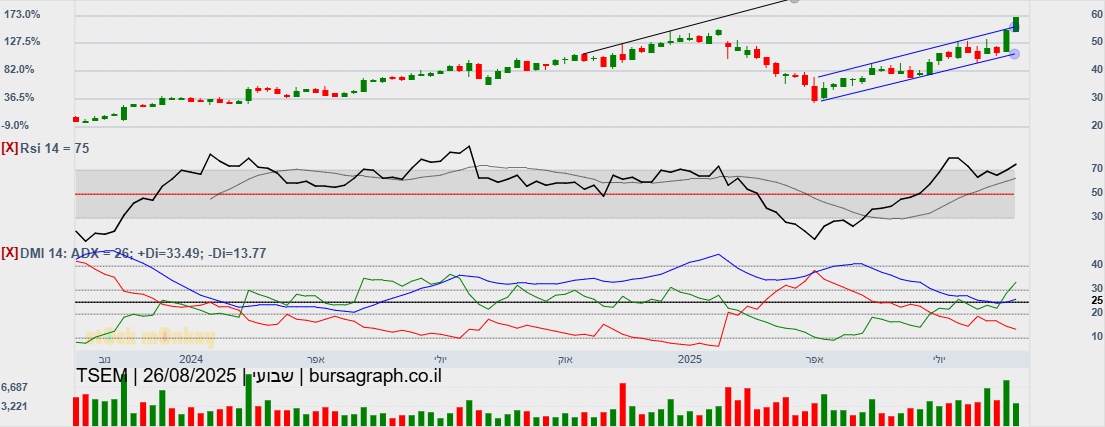 בקטנה בשבועי,ובמחזור עוצמתי מאחר וכל השבוע המסחר היומי נסגר במחזורים מאד גבוהים. להערכתי אם יסגר מעל 61.35$ אזי האפשרות שימשיך גם מחר במהלך השורי,אולם אם יסגר מתחת ל 60$ אזי עשויים לרדת עד לרצועה האמצעית של בולינ',כשנכון לעכשיו הרצועה העליונה מתנגדת להמשך! כמו כן גם מתנד ה RSI תופס גובה,וגם מתחיל להכביד!