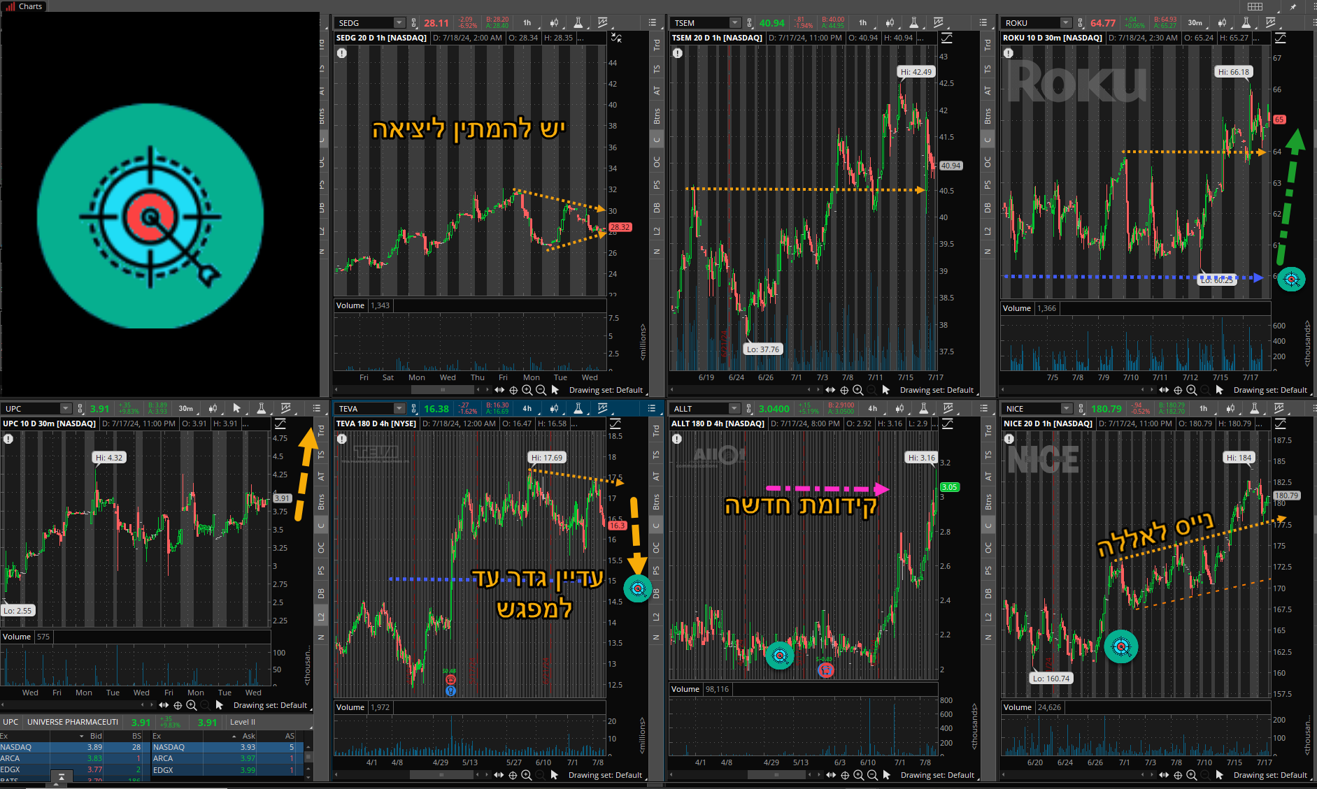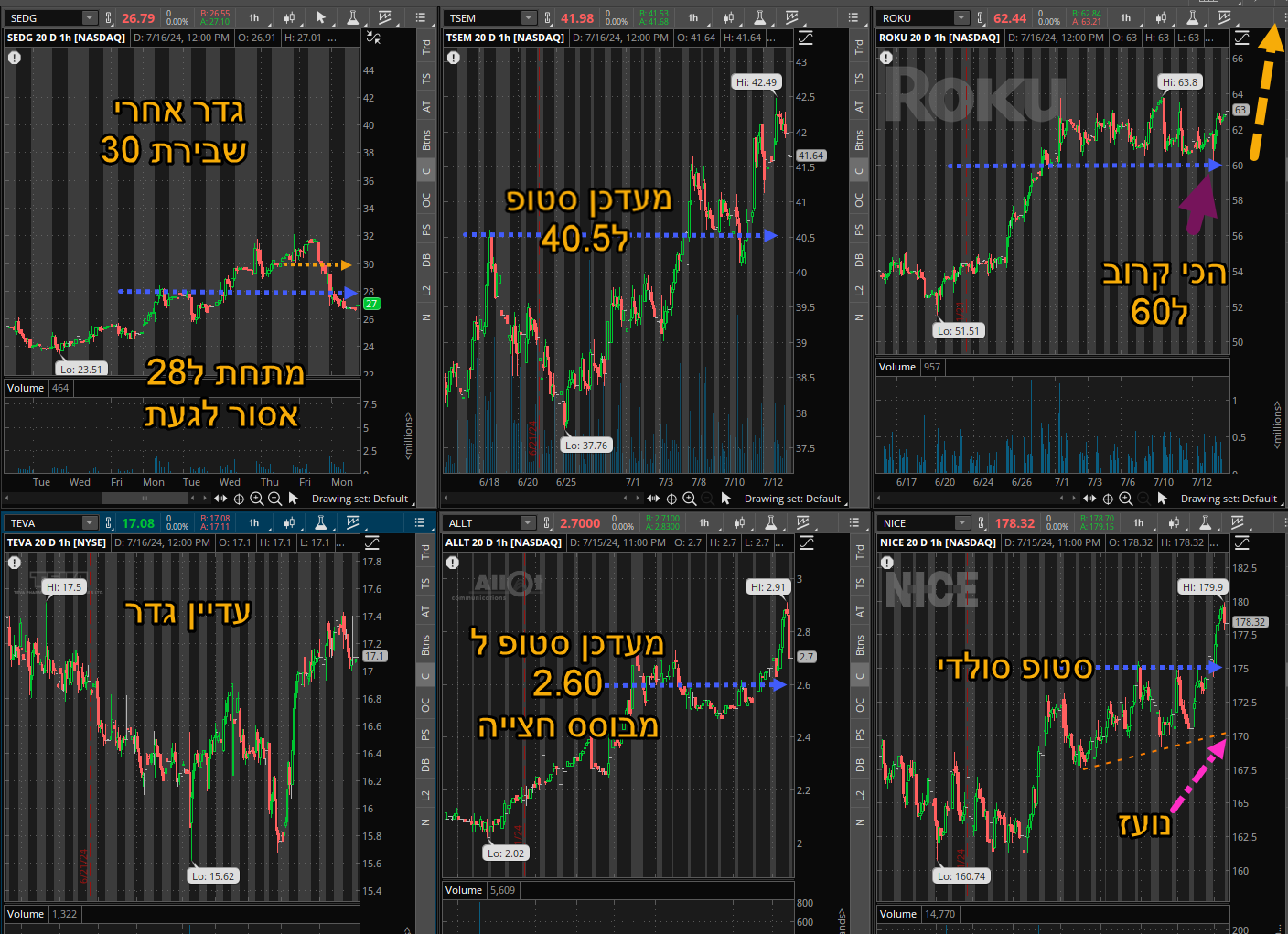SEDG יצאה אמש עם ארוע שלילי אחרי שנתנה את התחנה של 32 כשלה לשמור על 30 עפנו בסטופ מאחר ושברה גם את 28 כל עוד מתחת ל28 אין מה לגעת TSEM סטופ עולה ל40.50 ROKU נתנה אמש את הכי קרוב ל60 היו שהתלוננו :) אז הנה לכם אחרי אמש קיבלתם נקודת קניה מתחת לינשוף ALLT אחרי אמש עם גבוה של 2.91 ונסיגה מעדכן סטופ על בסיס חצייה לרמת 2.60 NICE חייבת לפרוץ את 180 אחרי פריצה ובמידה שנקבל כזו היעד= 210 מינימום !! TEVA עדיין בהמתנה על הגדר