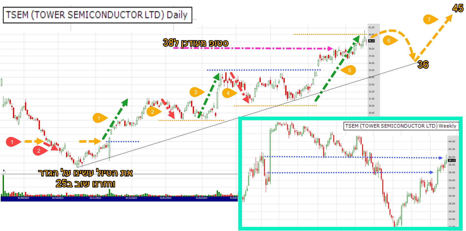 אנחנו אחרי השלמת שלב 5 ליעד מלא של 40 לפניכם גרף הסיכום הכולל + הצפי שלי להמשך הדרך כולל = העירו לי בפרטי שבסיכום הקודם לא מצויין שהיה טרייד ראשון כושל אז עכשיו זה מצויין ובאדום מה שנכון נכון בצד ימין של התמונה יש המחשה על הגרף השבועי למה 40 חזק אני לא מאמין שנקבל פריצה מיידית ניסיון כן אבל הפריצה בספק לכן לדעתי נרד לבדוק את 36 במידה ו36 יחזיק נחזור משם לפרוץ את 40 לשלב הבא עם יעד של 45 לשאלה למה הסטופ שלנו צמוד יותר הפעם ? כי פשוט חבל על הרווח במידה והסטופ שלנו יופעל על 38 החזרה תהיה או בפריצה מחודשת של 38 או על 36