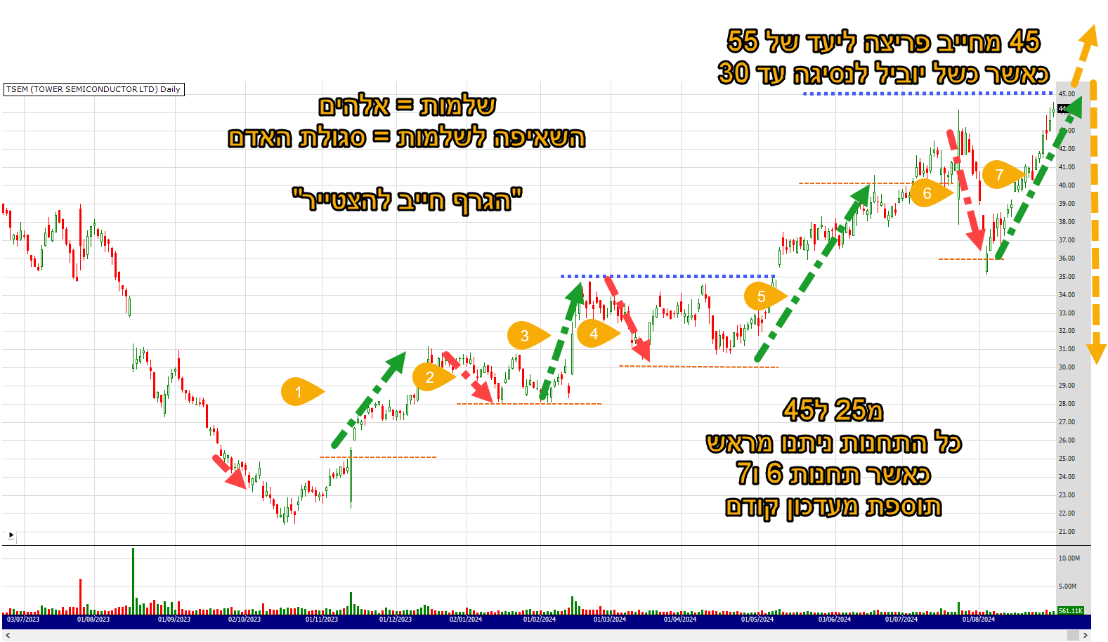 ברוכים הבאים ל45 יעד 7 על הסף יש לשים לב טוב טוב לגבי ההמשך : 45 שלב חשוב מאוד וחייב פריצה להמשך עולה כאשר היעד מעל 45 = 55 וכשל בפריצת 45 = ירידה לרמת 30 יש להתנהל נכון . סיכום : בסיכום קודם הוספנו 2 שלבים נוספים לצפי הכללי שכלל את שלב 6 לירידה עד 36 ואת שלב 7 חזרה ל45 את הגרף לא אני ציירתי אנחנו לקראת השגת היעד של 45 בלינק יש את הצפי הכללי הקודם וזה הציור שצוייר עד כו חשוב לציין : כל השלבים מ25 ל45 ניתנו מראש כולל את נקודות היעד ואת הנקודות לנסיגה השלמות היא אלוהית אני רק אדם שמשתדל לשאוף לשלמות לכן ישנם אי דיוקים קלים כמו לדוגמה : בירידה האחרונה נתנו חריגה קלה מתחת ל36 אבל אפשר לומר שעשינו כאן משהו בלתי אפשרי לא ? ניתן לראות ולא להאמין