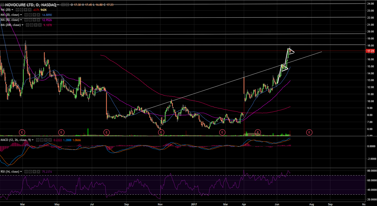 NOVOCURE נובוקיור מייצרת ומפתחת מערכות TTFIELDS לטיפול בגידולי סרטן מוצקים כחלק מהטיפול הכללי - כימותרפיה , ניתוח והקרנות. המערכת היא טיפול חשמלי המשבש את חלוקת התאים הסרטניים וגורם למותם ע"י הפעלת שדה חשמלי בעוצמה נמוכה על מולקולות בתא הסרטני. המערכת ORPUNE קיבלה אישור FDA כבר ב 2011 ונמכרת בארה"ב , אירופה ויפן לטיפול ב גליובלסטומה מוחית (GBM - צורת הגידול האגרסיבית והממאירה ביותר). ומראה תוצאות טובות ומוכחות בהכפלה ממוצעת של משך חייו של החולה. מפתח המערכת הוא פרופ יורם פלטי מהטכניון. לחברה 3 ניסויים שלב 2 - תוצאות טובות לסרטן שחלות ולבלב והארכת משך החיים\ שרידות של המטופלים . אלו סוגי סרטן קטלניים -הרביעי והחמישי בארה"ב . הודעה על הצלחה בשלב 2 יצאה ב17\4 ניסוי שלב 2ביניים למזותליומה ( סרטן ממאיר הנגרם מחשיפה לאסבסט) . ו 9 ניסויים פרה קליניים. החברה נסחרת בשווי 1.5B$ .בדוח האחרון החברה הראתה עליה בהכנסות ל 35M$ בהשוואה ל 13M$ ברבעון המקביל בשנה קודמת. עדיין הפסד נטו 18M$ אך במגמת ירידה משמעותית. לחברה מזומן לשנתיים והיא פועלת על מנת להסדיר את תכנית מדיקר, מה שיכול להביא דחיפה משמעותית לחברה. בתהליך ההסדרה יש כבר מטופלים המכוסים במדיקר ויפוצו רטרואקטיבית במתן האישור. גם ללא מדיקר יש עליה של 80% במספר המטופלים במערכת בהשוואה לרבעון מקביל .החברה משקיעה הרבה בשיווק והדרכת רופאים במערכת TTFIELDS אשר נוטים עדיין להישאר סקפטיים ובחשיבה מסורתית. 5 אנליסטים מסקרים את המניה ב YAHOO - קונצנזוס 20$ , בין 14$-34$ התחילה מהלך יפה מתחילת החודש , בונה דגלונים- אפשרות למהלך בפריצת הדגלון, התנגדויות : 18 , 19.60 , 22 תמיכה 15.70$ , לא ממליץ כלום