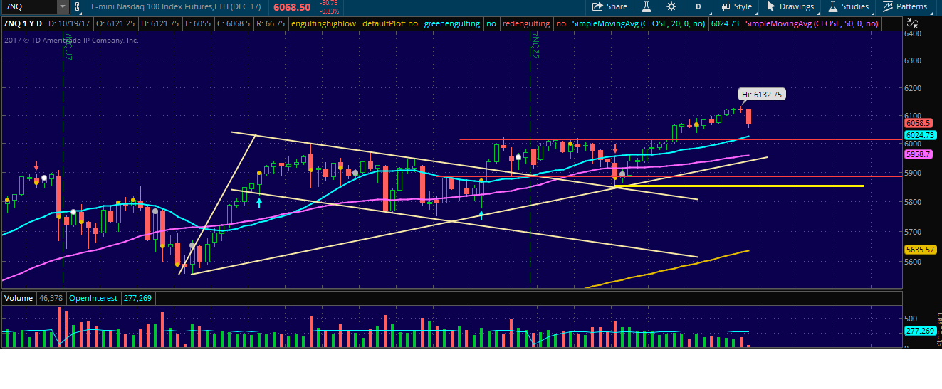 הירידה היום קצת חריגה כי היא שוברת נמוכים של כמה ימים אבל בהחלט לא שבירת כלים כללית על השוק לזה יש זמן עדיין ! בכל אופן עושה רושם שהתיקון הזה יכול להגיע בשלב ראשון 6000 שזה גם +- ממוצע 20 יומי ו השיא האחרון שנפרץ ולא נבדק . שבירה של 6000 (מה שאני לא בטוח שישבור נכון לכרגע ) השוק יירד לאזור 5950 שם אזור תמיכה חזק שינוי מגמה לטווח בינוני רק מתחת לקו הצהוב 5850+- בסגירה. היעד שלי עדיין נשאר 6400 לנסדק גם אם ירד חזרה ל 5850(מה שאני לא בטוח שיקרה לפחות לא כרגע ) זה פחות או יותר פריצה של תבנית הדגל שהעלתי . הקווים האדומים הם גאפים פתוחים שלא רואים אותם בגרף 24 שעות