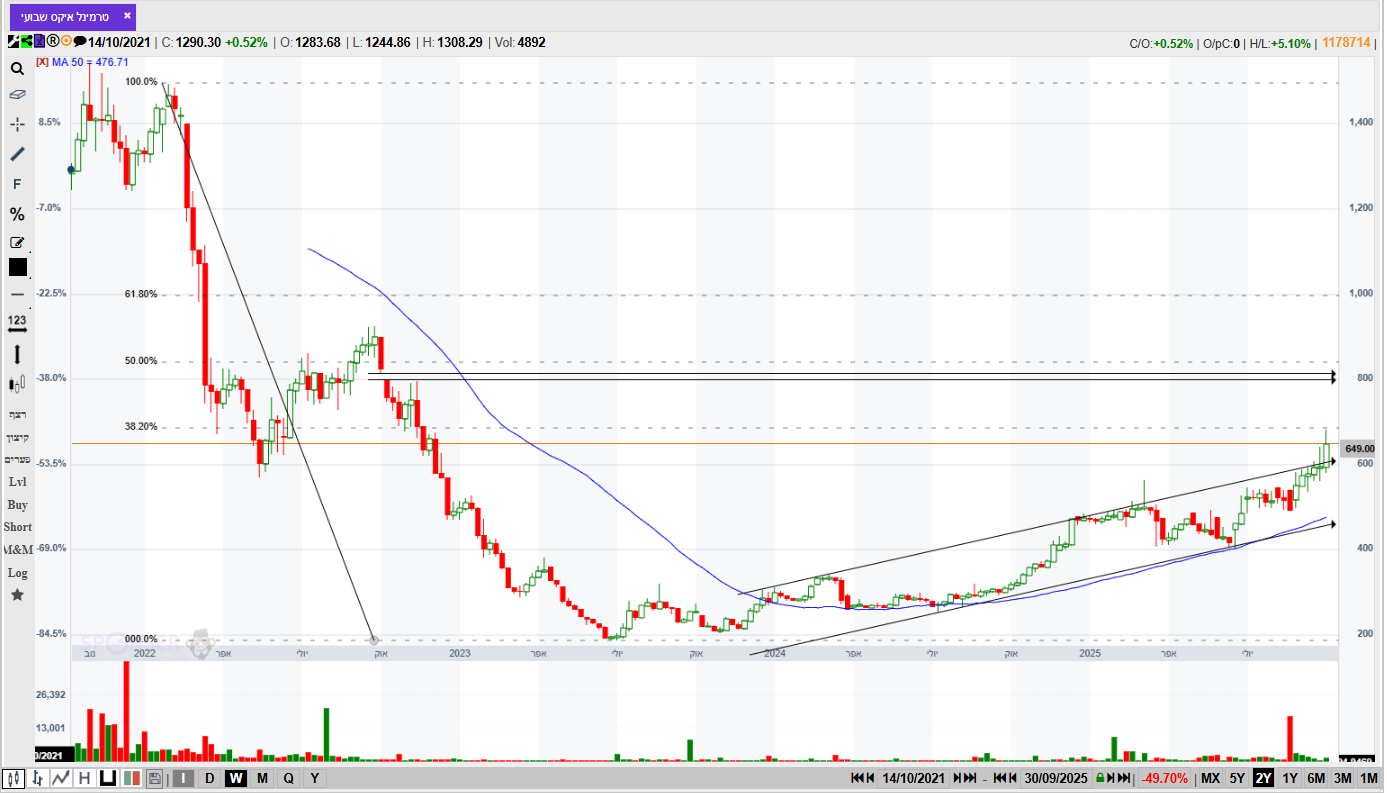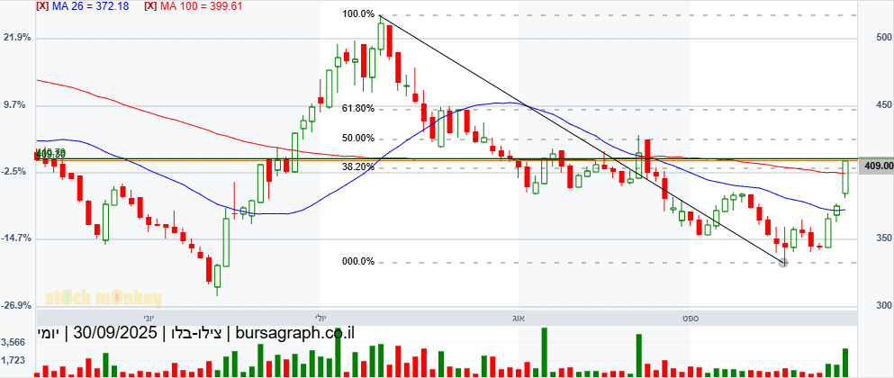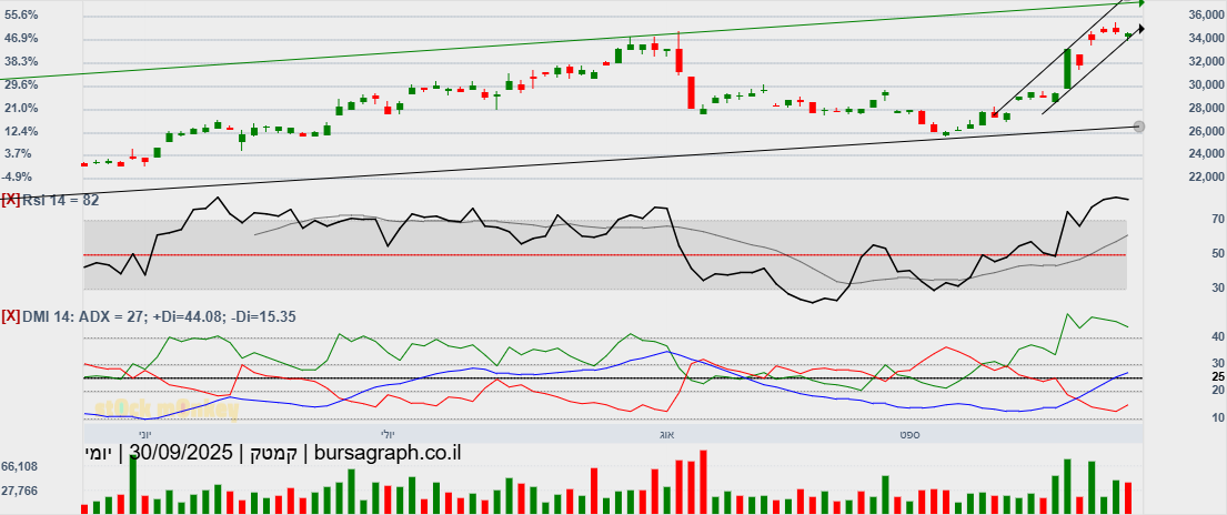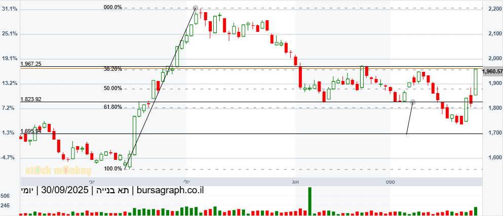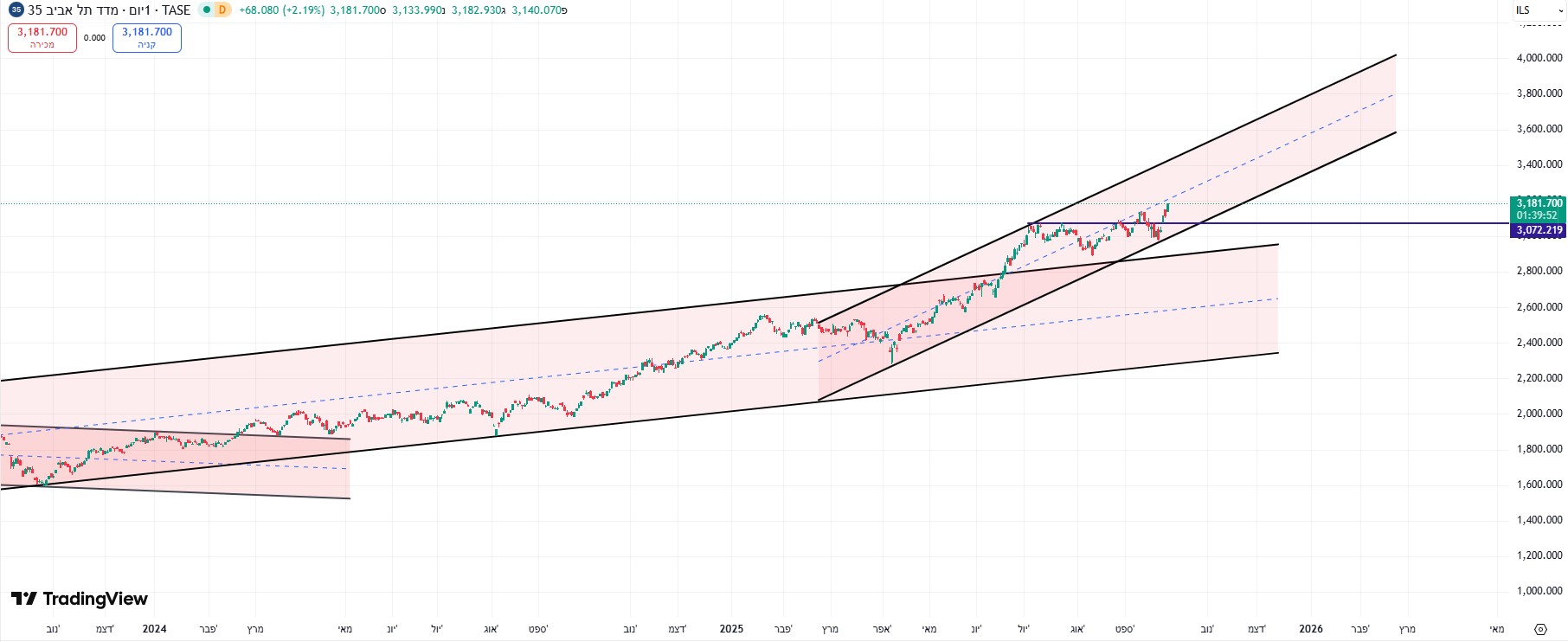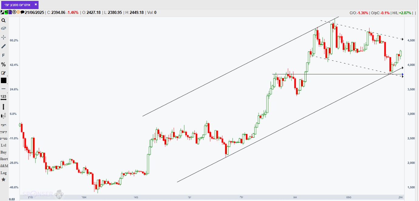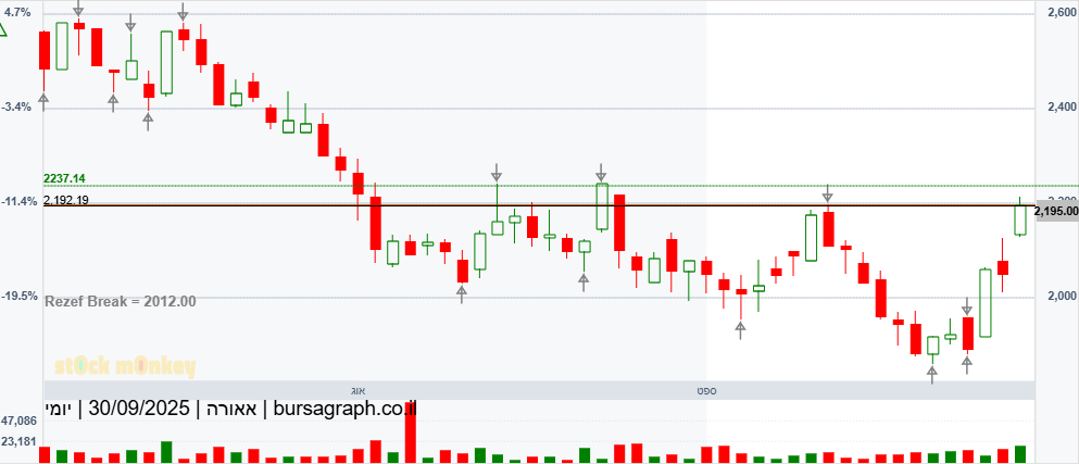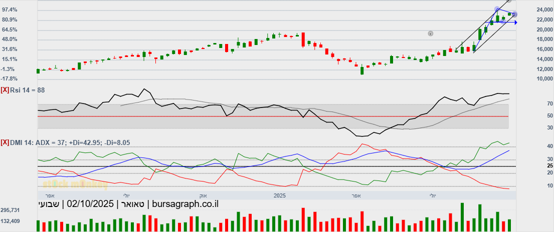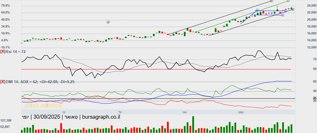 מספר ימים של עליות חדות גם בת"א,וגם בנסדק,וניגובים של שיאים שנתיים חדשים,התממשה המניה ביום המסחר האחרון ב4.5%,ובמחזור גבוה מאד של מעל ל 110% מהממוצע התלת חודשי,וסגרה למרות המימוש החד בארביטראג' של 2.2% חיובי,ובשער של-24000,כשהיעד לע"ד הוא קצה התעלה המינורית הירוקה שעומד על25850,ומהווה בהתאמה גם את יעד הדגל,הערכתי אחרי חוסר של שלושה ימי מסחר בת"א!😱