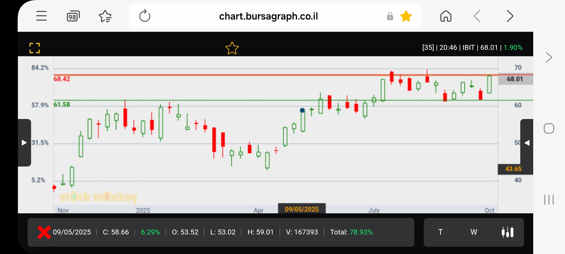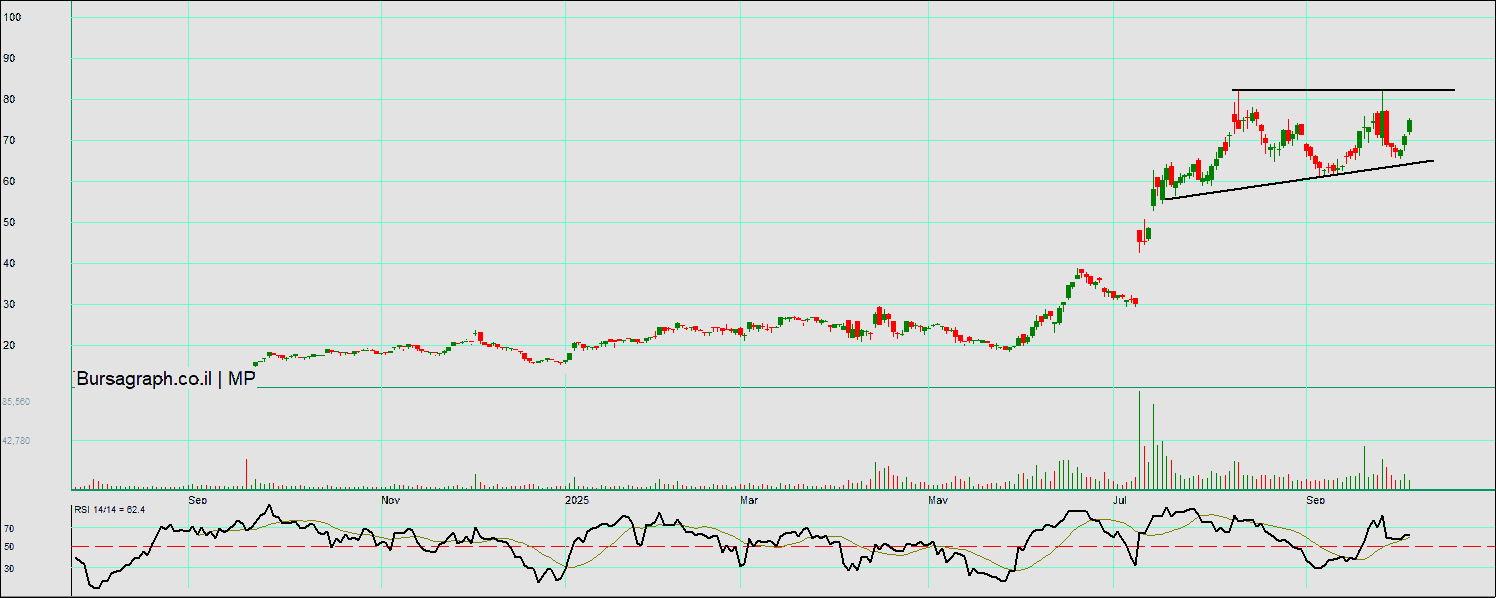 עולה לגבהים חדשים המהווים את שיא כל הזמנים,וכרגע עוברת לנר פטישי עם זנב קונים,כשהמחזור בינוני+.כמו כן אם תימשך המגמה השורית במניה אזי היעד הבא-82.5$. כדאי מאד ואף מבוקש שנותר עוד יום מסחר של שישי מעבר לים,ומספר ימים שלא נתקימו בת"א! בנוסף לנל,ואחרי שנפרץ הדגל,בטכני רחוקים מיעד הדגל היום ומתקימות ההפרעות בדרך של קצה התעלות המינוריות, כשבנקודות הנל יכולות להיכנס מימושים!🙇