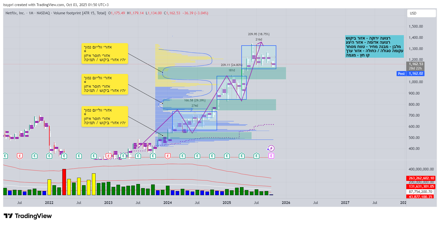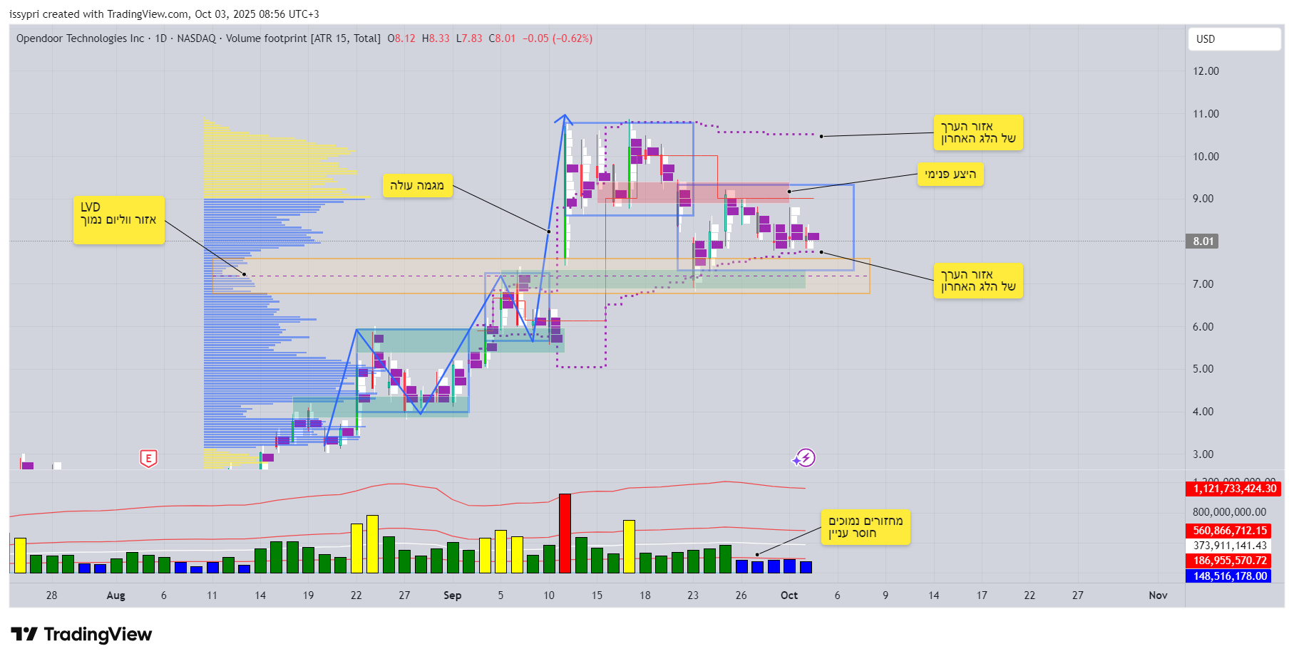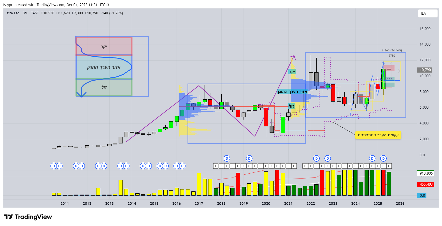 שלום, החלטתי לעשות פוסט על צורת ניתוח לפי תאוריית המסחר ולהראות אות בפועל שלב אחרי שלב. אתמול הבאתי קישור לסרטון באמריקאי של ראיון מרתק ומסחר בחי עם Fabio Valentini, סוחר שהגיע באופן עקבי לטופ של סוחרי יום בתחרות היוקרתית ביותר לסוחרים, Robin’s Cup. שווה מאוד צפיה. הוא בבסיס משתמש בתיאוריית המסחר. תיאוריית המסחר אומרת בקצרה שמחיר מניה נמצא כל העת באיזשהו טווח מסחר, טווח מסחר הוא איזון שקובע מה טווח המחיר ההוגן (FAIR VALUE), מה יקר ומה זול. שמחיר נע בין אזורי מסחר הוא מפר איזון בתנועה חד צדדית - ראלי. את המפה של אזור מסחר אפשר לראות בכלי שנקרא - פרופיל ערך שזה למעשה ווליום רק בחתך מחיר ולא בחתך זמן. 0מהצד ולא מלמטה). הפרופיל מייצר עם הזמן היסטוגרמה שנותנת את התמונה. אני אוהב להשתמש באזור הערך המתפתח שהוא חלק מהכלי כדי לראות תמונה בזמן אמת פחות בדיעבד. דבר נוסף הם דרגות של אזורי מסחר. הניתוח נעשה תמיד מלמעלה למטה. אם אתה סוחר סווינג למשל, אני מתחיל בגרף חודשי / 3 חודשים, יורד לשבועי ואחרי זה ליומי ואולי שעתי. סוחר תוך יומי יתחיל בשעתי וירד לדקות ושניות. מאחר והשוק פרקטלי, טווח מסחר יתנהג אוטונומי אך במגבלות הטווח הגדול יותר, כלומר הטווח הגדול יותר יציב גבולות חשובים יותר מעל הטווח הנוכחי. בסופו של יום אם אתה משקיע או סוחר סווינג או סוחר יום המטרה היא אחת - לקנות זול ולמכור יקר (או הפוך בשורט). עוד דבר משותף לכלל הסוחרים - אנחנו תלויים בשוק ולכן לא נלך נגדו או ננסה לנבות אותו. תמיד ננסה לקרוא אותו. עוד כמה מילים על שיטות ותאוריות - 1. אין תחליף להתנסות. אם מישהן לימד אותך תאורייה , כדי להיות טוב בה צריך להתנסות באלפי תרחישים וגרפים מה שלוקח לעיתים שנים. אין תאוריות פלא או קורס שיוציא אותך מנוסה ומוכן. 2. ניהול סיכונים - בסרטון פביו אמר דבר מפתיע - הוא לא מסכן יותר מ0.25 עד 0.5 אחוז מהתיק שלו בטרייד בודד. זה מאוד מפתיע למי שהוא בטופ העולמי. אבל אם חושבים על זה, זו הדרך להרוויח באופן מתמיד כי שוק ההון לעיתים מאוד לא צפוי ומי שחושב שתפס את השיטה ושם סיכונים גבוהים, יפסיד את התיק מאוד מהר. את ההדגמה אני עושה על מניית איסתא עלייה דיווחתי כניסה ויציאה בטרייד קצר של מספר ימי מסחר שעשה תשואה של כ 10 אחוז. נתחיל בגרף שלושה חודשים. אנחנו יכולים להבחין בשני אזורי מסחר גדולים. הראשון בין 2016 ל 2022 והשני 2022 עד היום. לאזור הנוכחי שמתי פרופיל ערך עם הסבר פשוט - אזור ערך הוגן, זול, יקר. המחיר נמצע כעת באזור היקר של הטווח הנוכחי ברמה הגבוה ביותר ולכן יש להיזהר מאוד (לדעתי) עם טריידים של לונג ולכן נכנסתי ויצאתי מהר תוך ניצול של אזור משנה. אני אראה את זה בשרשור.