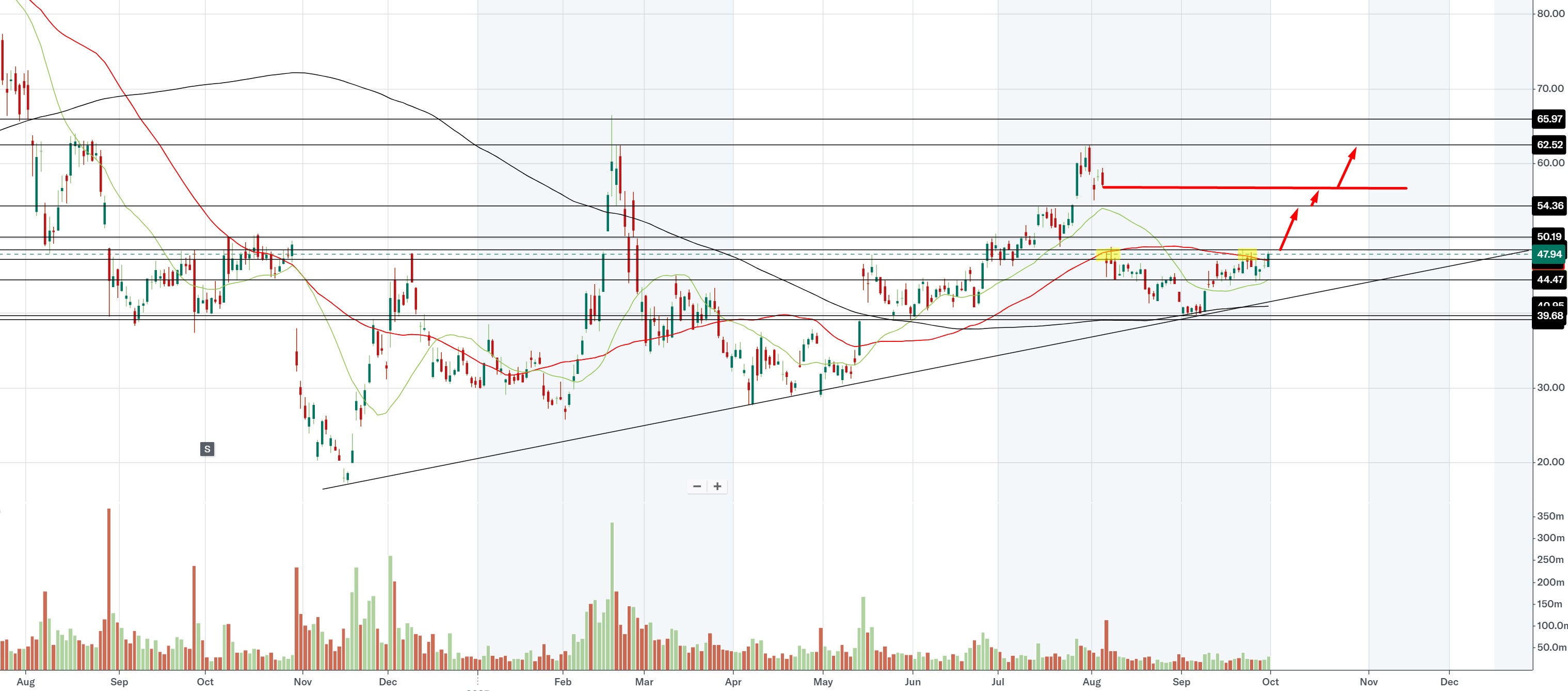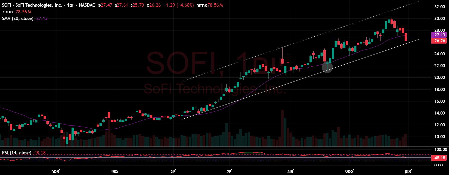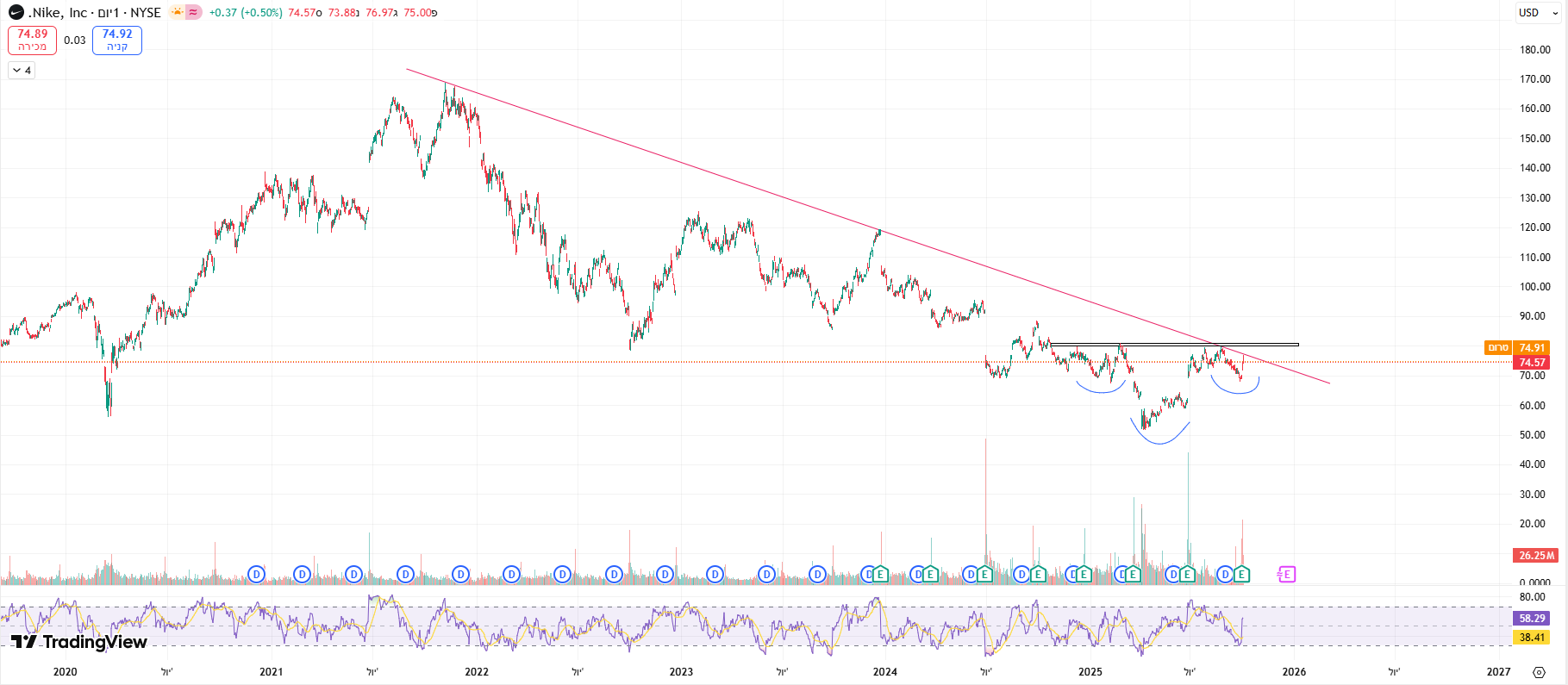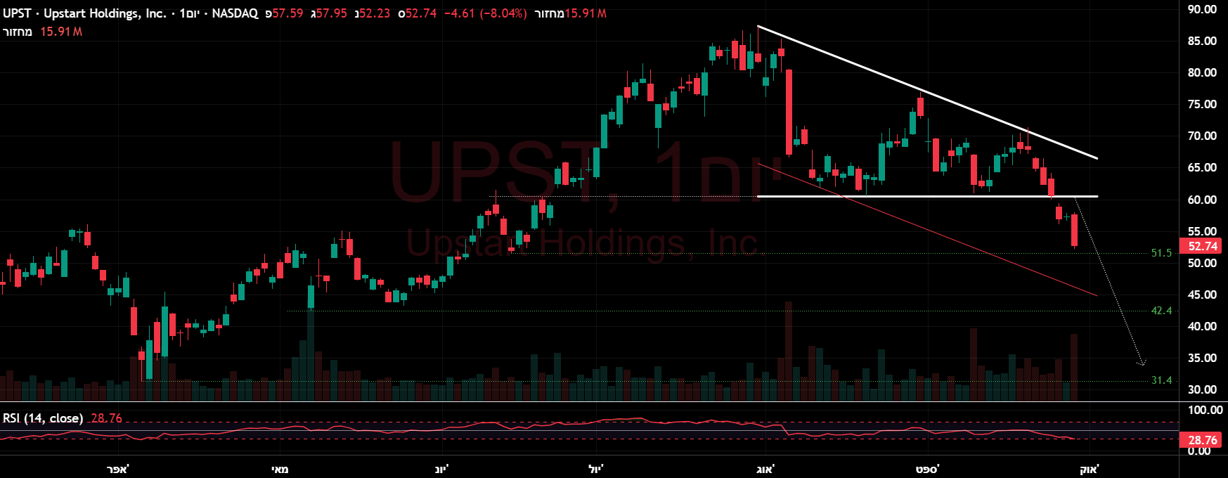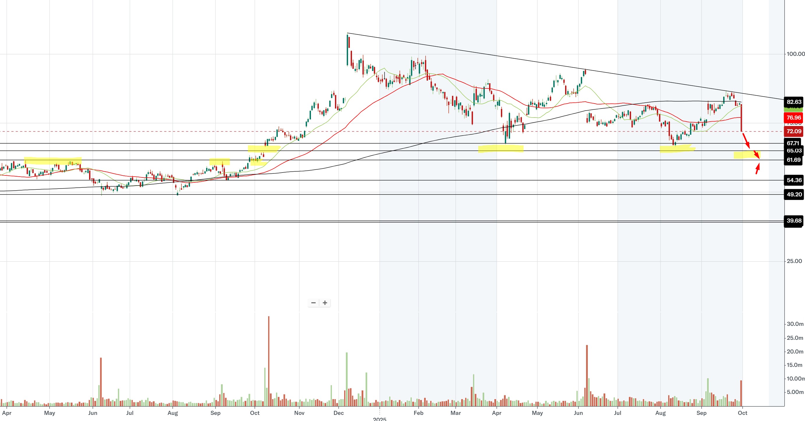 ירידה חזקה במניה עם מחזור גדול, לאחר הודעה של OPEN AI על התחלת שיווק מוצר מקביל, המהווה מוצר עיקרי ובמגמת צמיחה של DOCU ולמעשה נוצרה בו תחרות משמעותית...... הניתוח טכני בלבד, תמיכה חזקה באזור הפריצה שהייתה (תבנית מלבן ט"א) בטווח 69.5-64.5 (תלוי מאיפה לוקחים את הפריצה שהייתה מזמן). לדעתי סטופ מוחלט לכל רכישה באזור 61.3-61.5!!!!! בנוסף יש גאפ מאזור הפריצה יושב על 64.47 (לדעתי המחיר ישאף אליו). בקיצור יש סיכון לתחרות ממשית אשר עשויה לנגוס בהכנסות החברה, ולכן הייתה תגובה חזקה אתמול בשוק..... לא ממליץ.