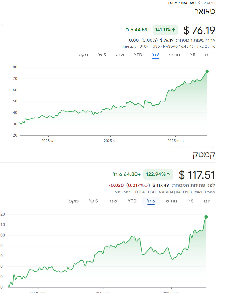 למי שזוכר השתלבו משבר המכסים של טראמפ יחד עם איום חודשיים קודם על השבבים מצד דיפסיק הסינית, [מה עם הסיפור הזה????..] מי שנכנס כשהיה דם ברחובות הרוויח בענק, המשחק היה פשוט להתעלם ולבודד את רעשי הרקע ולהבין האם באמת החברות הללו נחתכו בחצי כמו שניסו לצייר אז, או שהבהלה בשוק מוגזמת טאואר עלתה מאז 141 אחוז לשיאים חדשים [אני חיזקתי טאואר בשיא המשבר, הודעתי פה, ומאז לא מכרתי, בדיעבד כמובן הייתי מחזק הרבה יותר אבל גם ככה היא אחזקה ענקית אצלי] קמטק עלתה מאז 122 אחוז, בישראלי עלו בערך 10 אחוז פחות בגלל ירידת הדולר