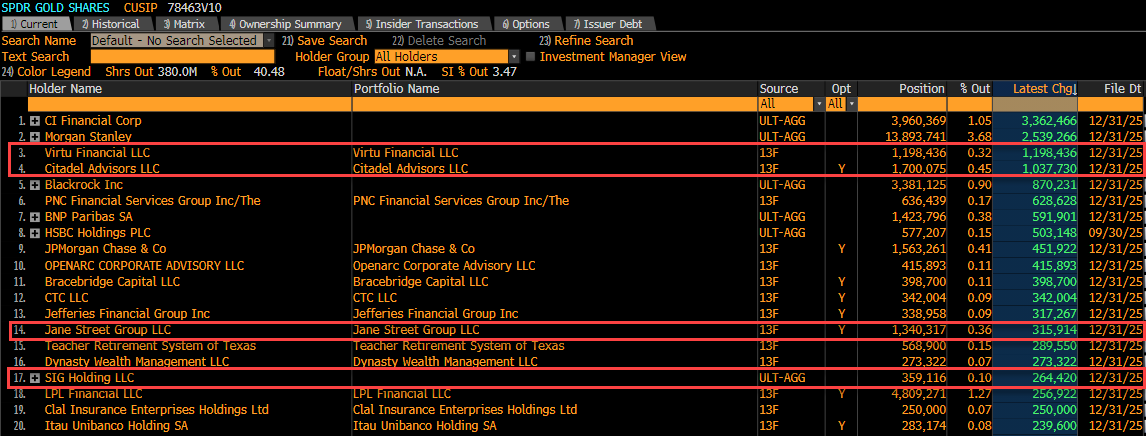 הגדולות בשוק בקרב הקרנות החזקות. האמת מספרים מפחידים הם קונות זהב בקצב כאילו מחר מתחיל מיתון סטייל 1929 סיכום קצר של הג'ימי לתמונה למתקשים: בויה, זו תמונת מסך ממסוף בלומברג (Bloomberg Terminal) שמציגה את בעלי המניות המוסדיים של תעודת הסל על הזהב (SPDR GOLD SHARES בסימול GLD), מעודכן לסוף שנת 2025. המסגרות האדומות מתמקדות ב"כרישים" הכבדים – עושי השוק וקרנות הגידור הכמותיות (HFT/Quants): Virtu, Citadel, Jane Street ו-SIG. מה התכלס שהטבלה צועקת? כניסה אגרסיבית לזהב: תסתכל על עמודת Latest Chg. כל הגופים המסומנים הגדילו פוזיציות בצורה מטורפת. Virtu לבדה העמיסה כמעט 1.2 מיליון מניות, ו-Citadel הוסיפה מעל מיליון מניות לפוזיציה שלה. פעילות ערה בשוק האופציות: שים לב לעמודת ה-Opt (Options). אצל Citadel ו-Jane Street מופיע Y (Yes). המשמעות היא שהם מחזיקים פוזיציות אופציות על הנייר. הם לא סתם יושבים על נכס הבסיס החשוף, אלא משלבים את זה עם הנגזרים – כנראה מנהלים גידור (Delta Hedging) וכותבים פרמיות כדי לנצל את התנודתיות של הזהב. השורה התחתונה: ה"כסף החכם" והאלגוריתמים דחפו הון עצום לזהב בסוף 2025, כנראה כגידור מקרו או כזיהוי מומנטום חזק, כשהם מגדרים וממנפים את המהלך דרך אופציות.