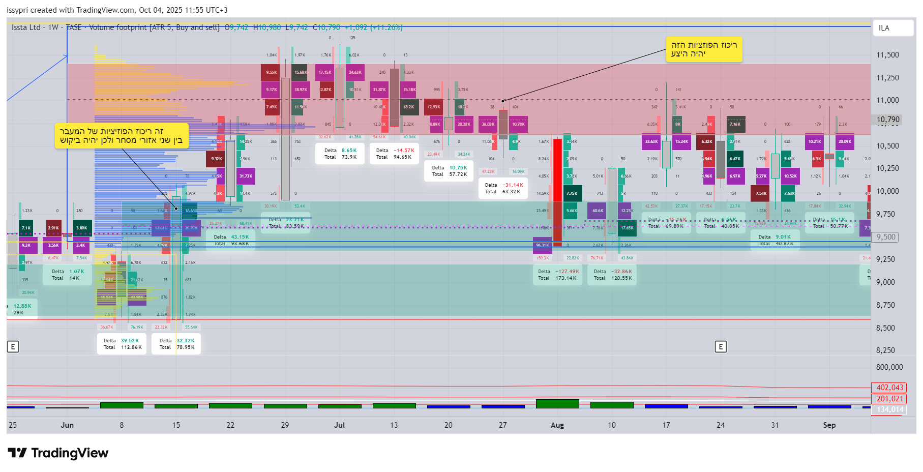 אני עובר לכלי שנקרא - FOOT PRINT בtraiding view שמראה לי פוזציות בתוך הנר (עסקאות ווליום). אני אסמן את נר המעבר בין המבנים ומשם אסמן את אזור הפוזיציות, כלומר את הווליום הגבוה בנר. זה יהיה ביקוש כי בדרך כלל שהמחיר חוזר לשם הוא מגיב. את הטרייד אקח מהביקוש להיצע שנוצר בטווח. כאמור, המחיר בחלק היקר של הטווח הגדול ולכן כל עוד לא נוצרה מציאות חדשה, יש לכבד את השוק ולא לנסות לנבות אותו אלא לקרוא אותו. מכאן, טרייד קצר שפי שדיווחתי השבוע.