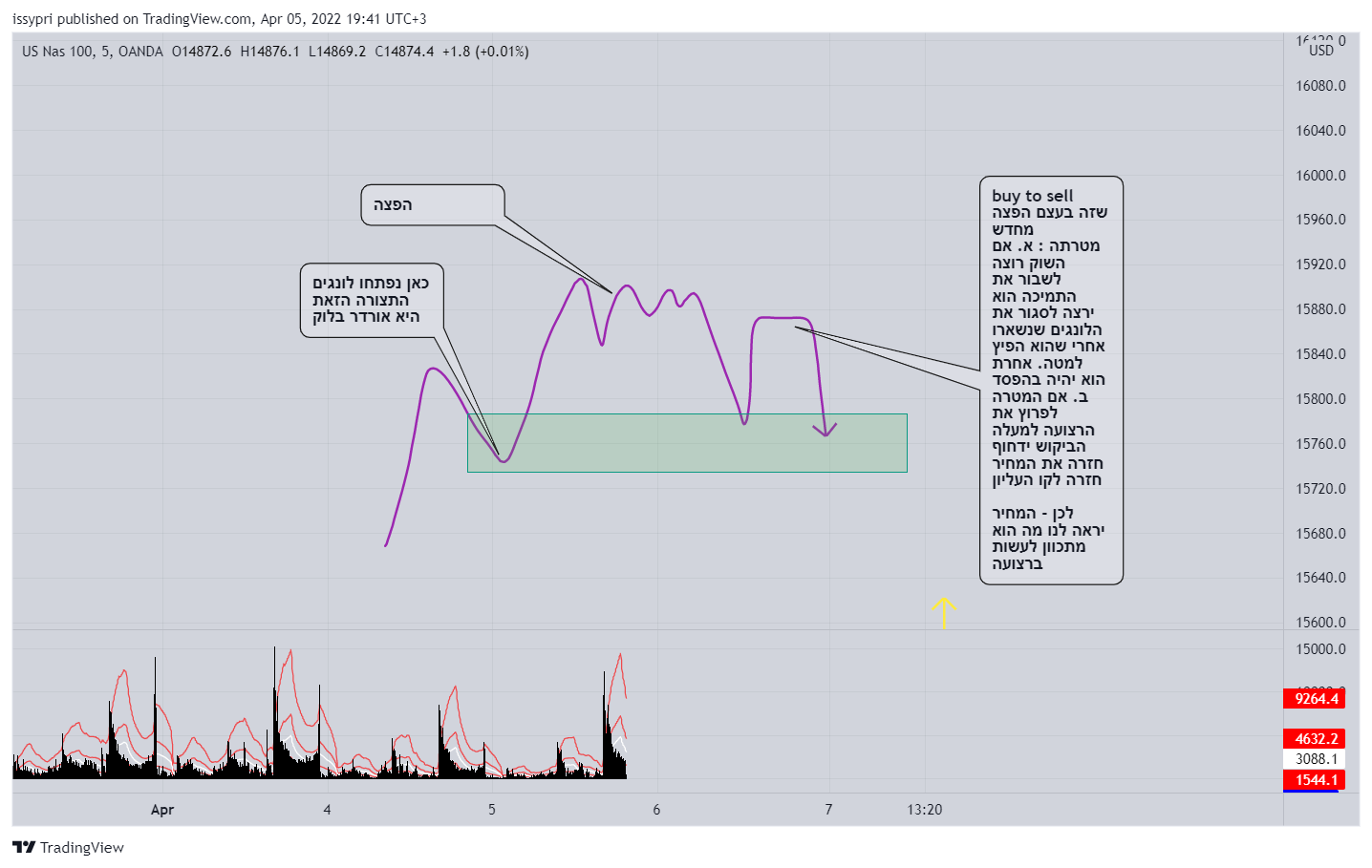 הקו המרוסק למעלה - קו גבוה של מבנה יורד שעדיין לא נשבר הצפי שלי היה שלפני שהמחיר יפרוץ (אם יפרוץ) הוא ירצה לבצע תיקון שמטרתו לרדת מתחת לנמוכים לקחת נזילות. הצפי שלי מה 1 לחודש - בצהוב (צפי עקרוני, לא מדוייק מבחינת רמת המחיר) התנועה האחרונה (מסומן בחיצים כחולים) ניראת כמו buy to sell. דחיפה למעלה כדי למכור ואז לרדת תוך כדי פתיחת שורטים כדי לקנות נמוך יותר. המחזורים בירידה חזקים הרבה מאלו שדחפו למעלה. התממשות התרחיש שלי תלוי ברצועה המסומנת למטה 14738-14947. אם היא תשבר אז צדקתי. בקיצור - הצפי שלי נשאר - המחיר יתקן נמוך יותר. התממשות התרחיש תלויה בשבירת 14738.
