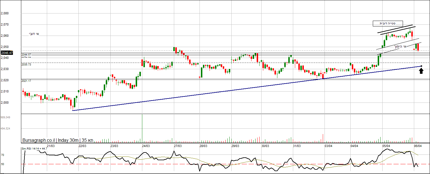אתמול נצפתה סטיה דובית על פסגה כפולה. אני מתחבט אם יש כרגע אי היפוך דובי... אם הגאפ היה טיפה למטה יותר זה היה מושלם. בכל מקרה...2042-2044 תמיכה אופקית. רק מתחת אליה ירדו חזק יותר לכיוון התמיכות האחרות המסומנות