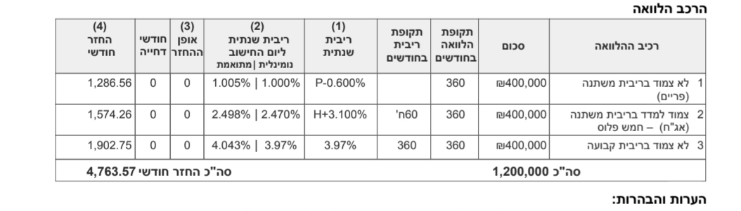 היי לכולם, אני מעוניין לקחת משכנתא לכל מטרה על מנת לרכוש נכס בחו״ל. הבנקים בארץ נותנים עד 50% מערך הבית בארץ. הצלחתי לקבל 910 אלף שקל משכנתא ל 25 שנים במסלולים הבאים. אשמח לקבל פידבק על המסלולים והריביות. 1. 303 אלף ש״ח - פריים + 2.2 (סה״כ 3.6% ריבית) - 1,576 ש״ח החזר חודשי 2. 303 אלף ש״ח - קבועה לא צמודה - 4.48% ריבית - 1,686 ש״ח החזר חודשי 3. 303 אלף ש״ח - משתנה 5 שנים, לא צמודה - 3.93% ריבית - 1,587 ש״ח החזר חודשי סה״כ החזר חודשי של - 4,850 ל 25 שנים. תודה על העזרה.